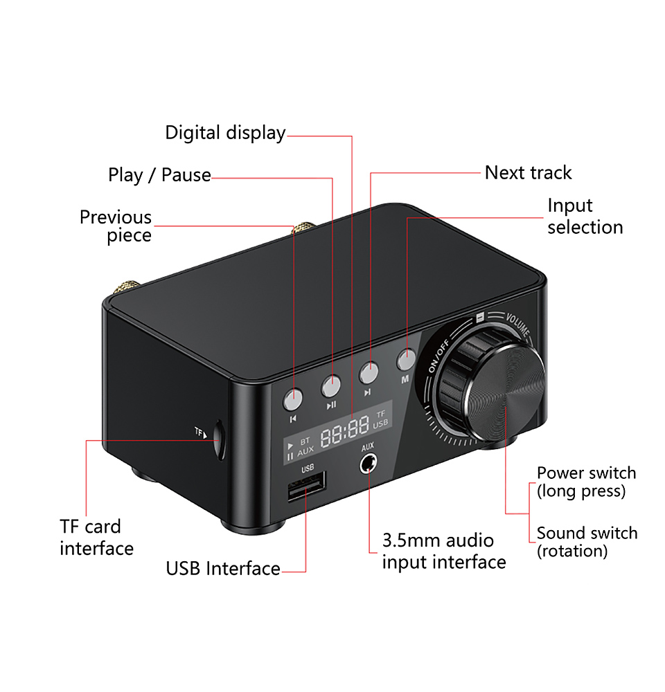 Audio input: 3.5MM stereo input, RCA stereo input, TF, U disk, USB audio input (can be connected to computer / mobile phone / OTG / tablet OTG)