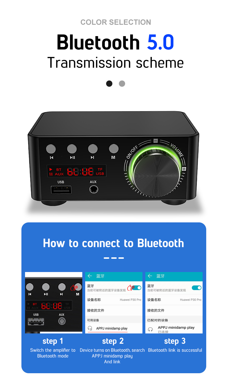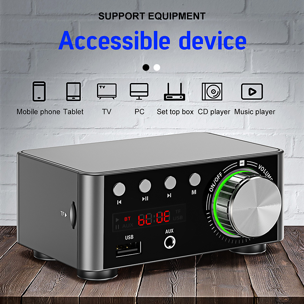 The amplifier can be connected to mobile phones, computers, tablets, notebooks, MP3s, TVs and projectors with AV audio (Lotus socket) or 3.5mm headphone output holes. A variety of mainstream Bluetooth devices for wireless transmission.