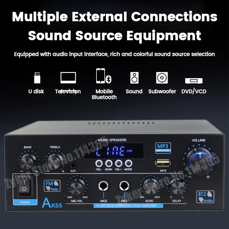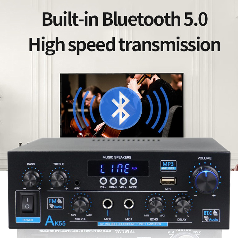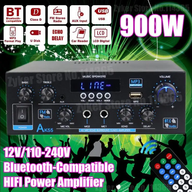 Усилитель звука AK55 HiFi Max, 900 Вт, цифровой Bluetooth-усилитель звука, канал 2,0, поддержка двойного микрофона, волоконно-коаксиальные входы, FM-радио