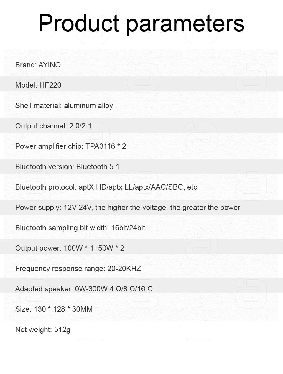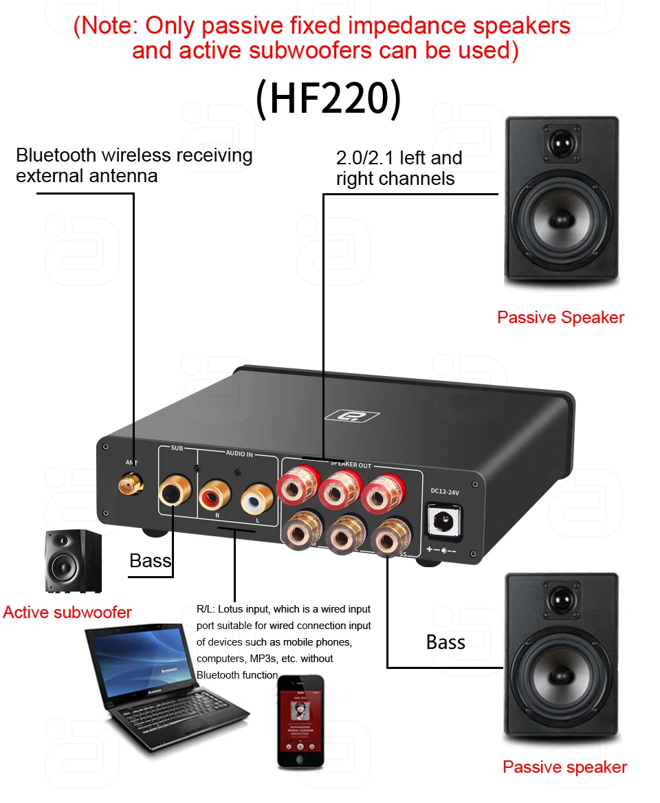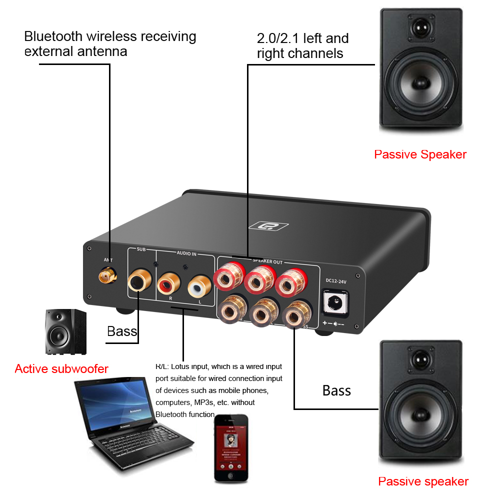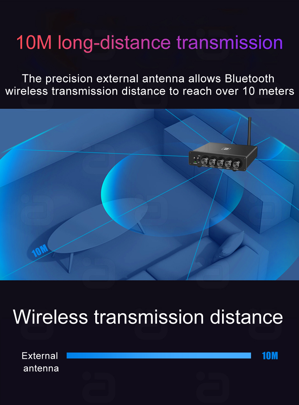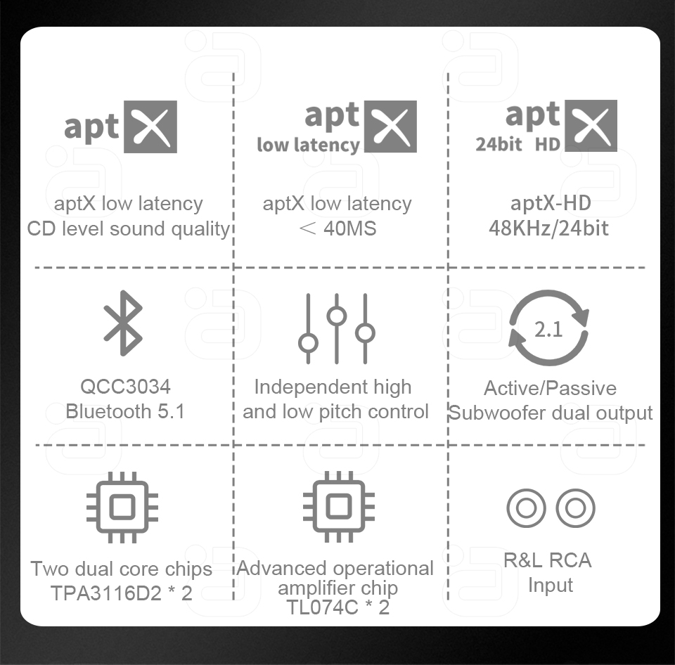 1. Поддержка двух входов, одного входа AUX, подключения проводного входа аналогового сигнала; еще один беспроводной вход Bluetooth 5,1 aptX HD, может подключаться к мобильному телефону, компьютеру и другим устройствам Bluetooth.
