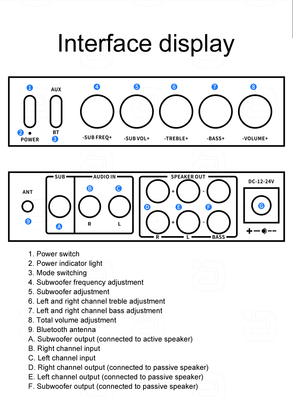 8. Функция ручки справа налево: Общая регулировка громкости, регулировка высоких частот левого и правого каналов, Регулировка низких частот левого и правого каналов, регулировка громкости сабвуфера, регулировка частоты сабвуфера.