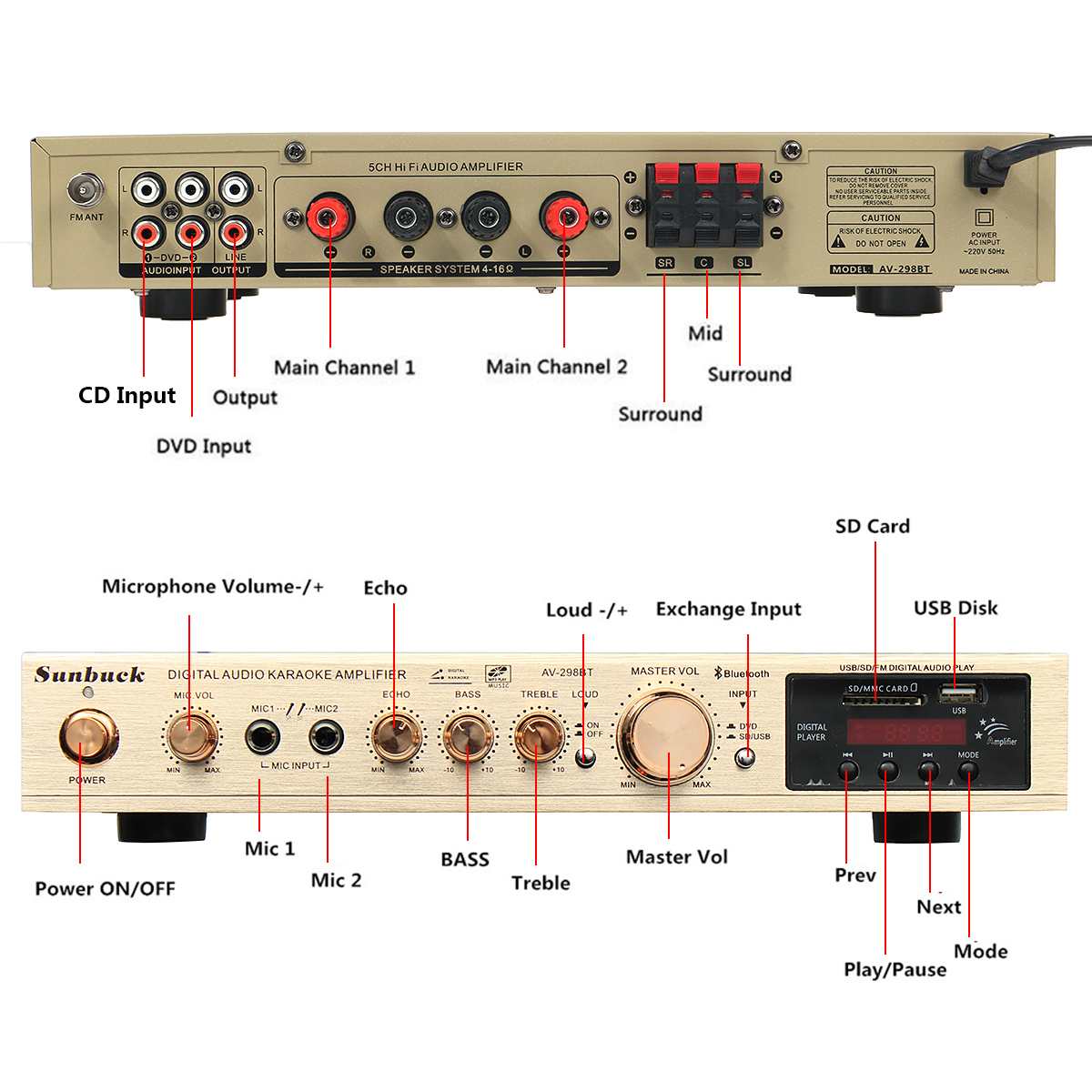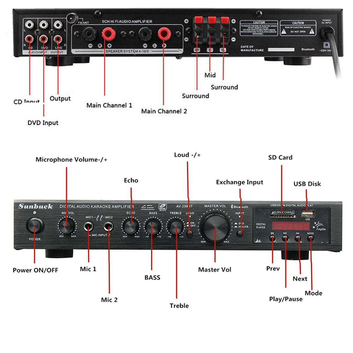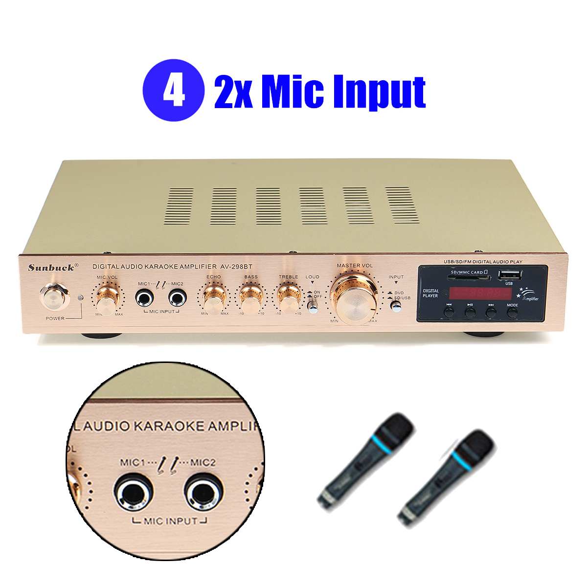-Двойной микрофонный вход, с 2 микрофонными входами, с регулировкой реверберации микрофона.