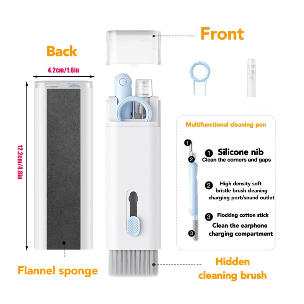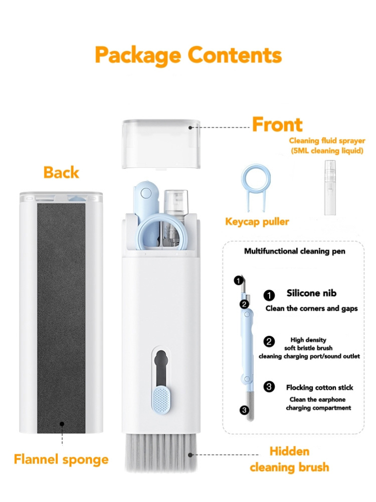 【Многофункциональный набор для чистки 7 в 1 】 Электронный Набор для очистки Включает ручку для чистки Airpods с силиконовой насадкой, мини-щетку и флокирующую губку; мягкая щетка высокой плотности, распылитель для очистки (пустой), салфетка из флиса и пряжка для клавиш. В наборах можно чистить наушники, клавиатуры, мониторы ПК, телефоны, камеры и т. Д.