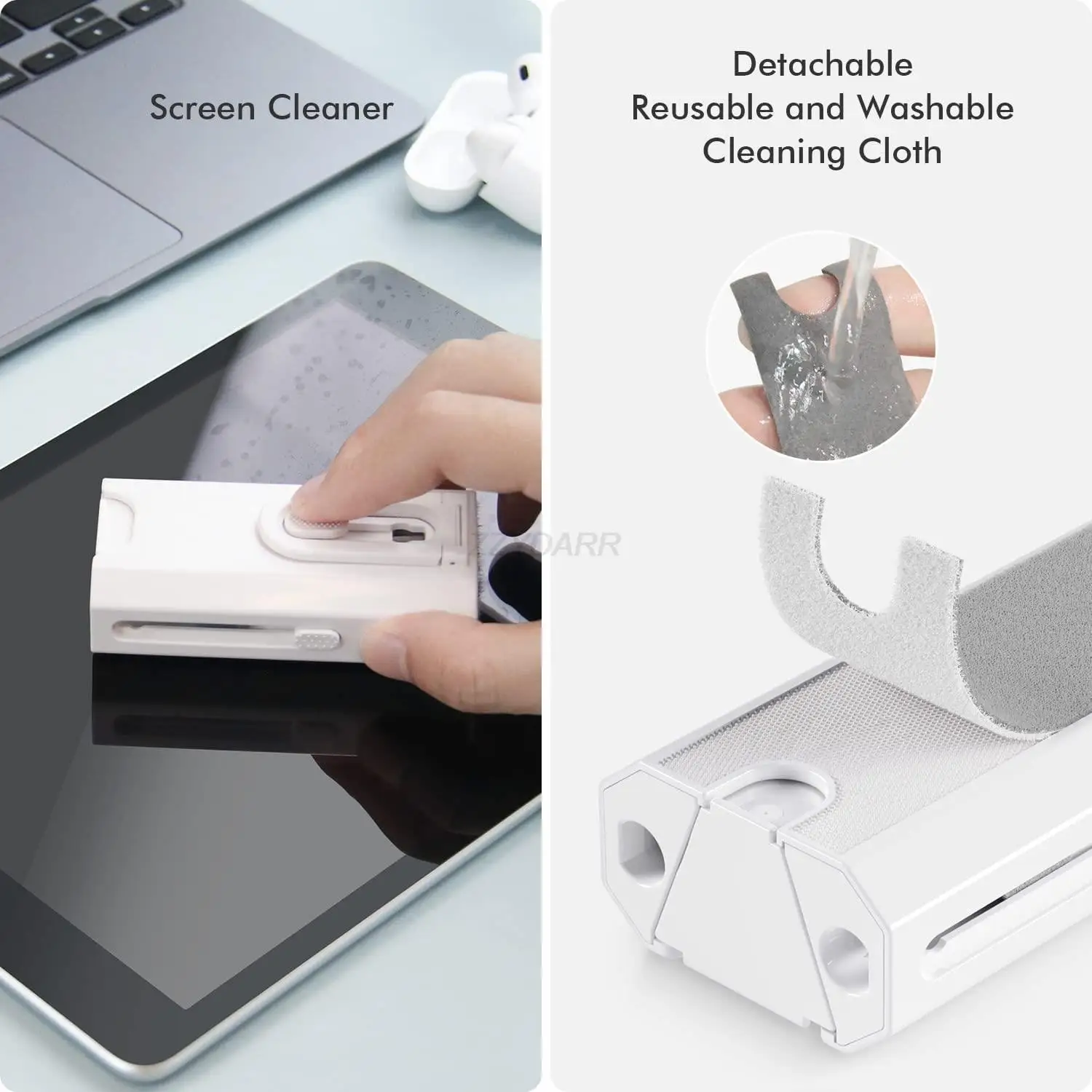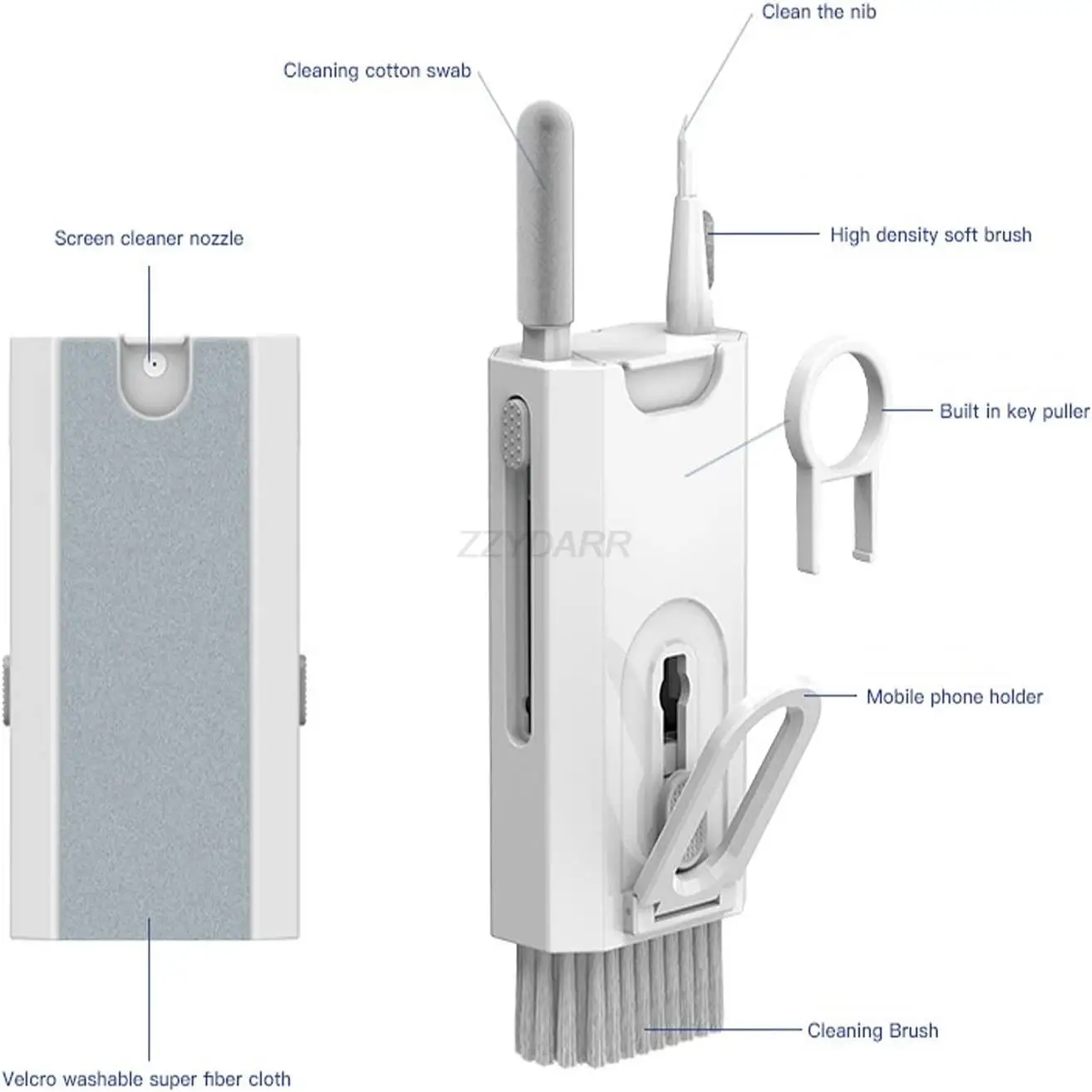 В многофункциональной чистящей ручке используется щетка высокой плотности, которая легко очищает клавиатуру, звуковое отверстие для наушников и другие детали. Металлический наконечник может очистить стойкую пыль и тщательно очистить зазор. Встроенная Ручка: переверните верхнюю часть флокирующей губки.