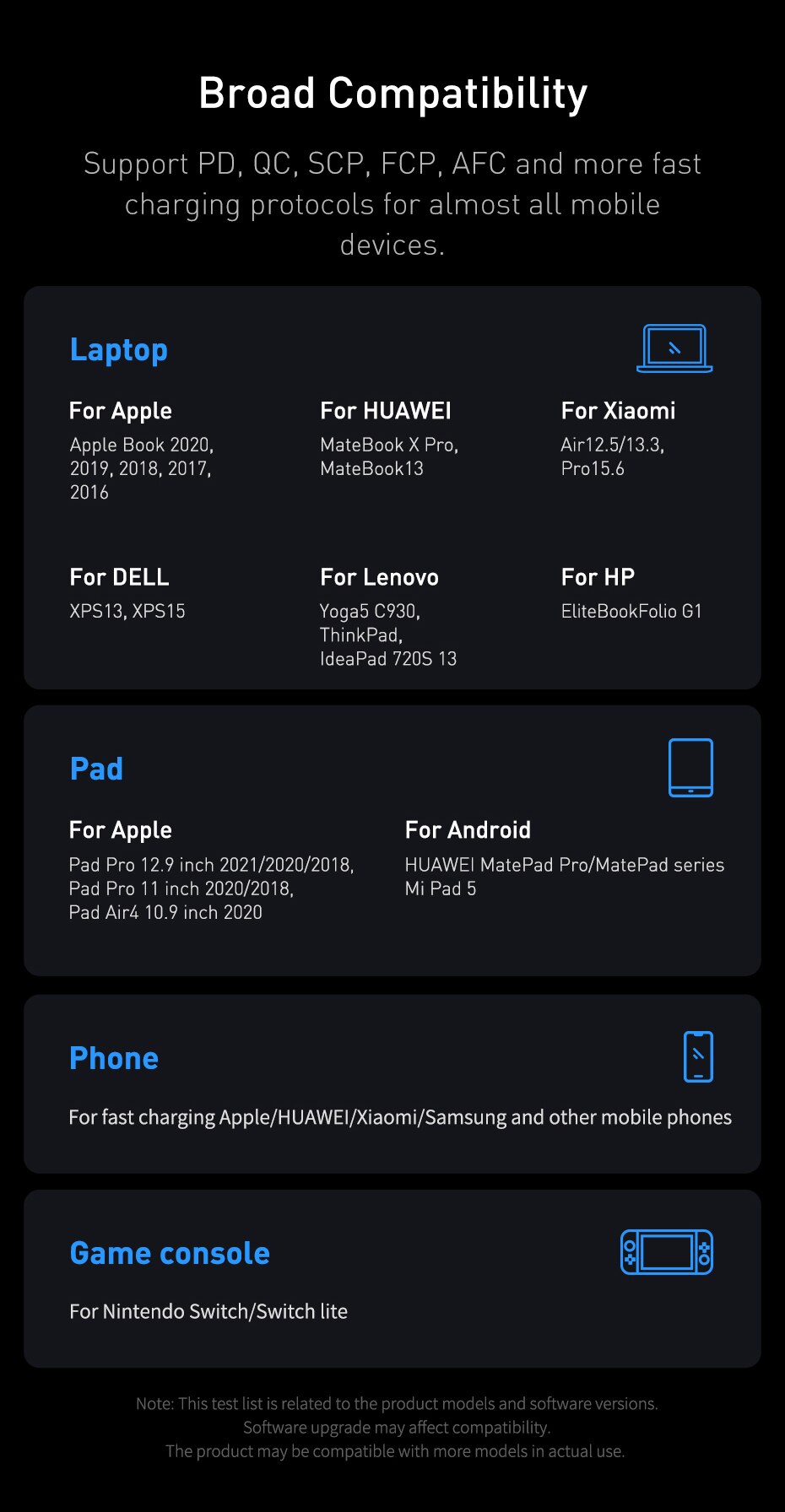 • Широкая Совместимость :Это зарядное устройство совместимо с широким спектром устройств, включая iPhone, телефоны Samsung и ноутбуки.