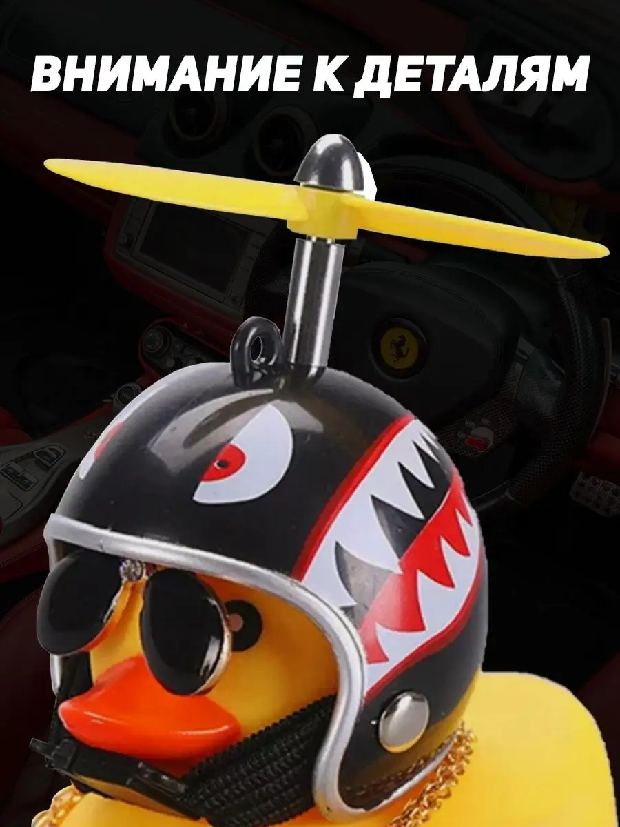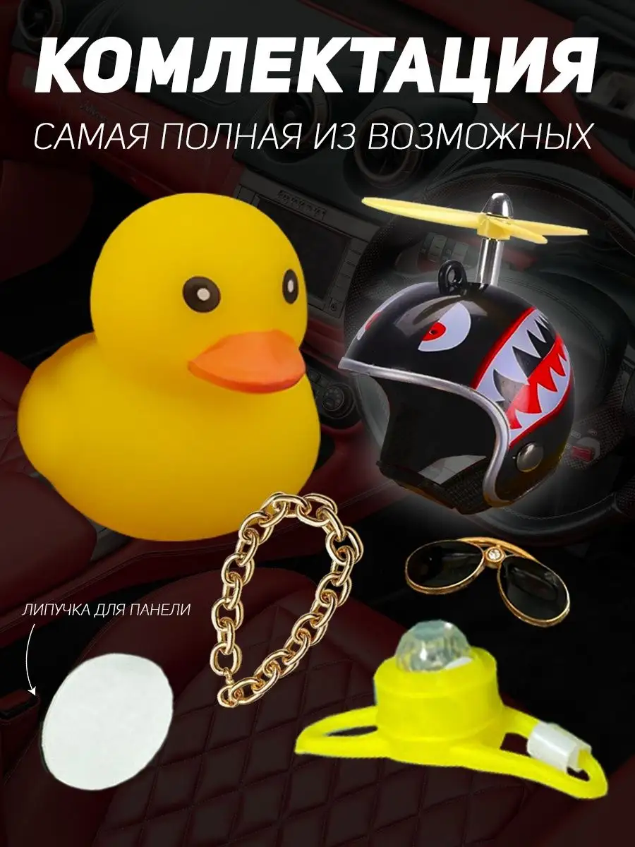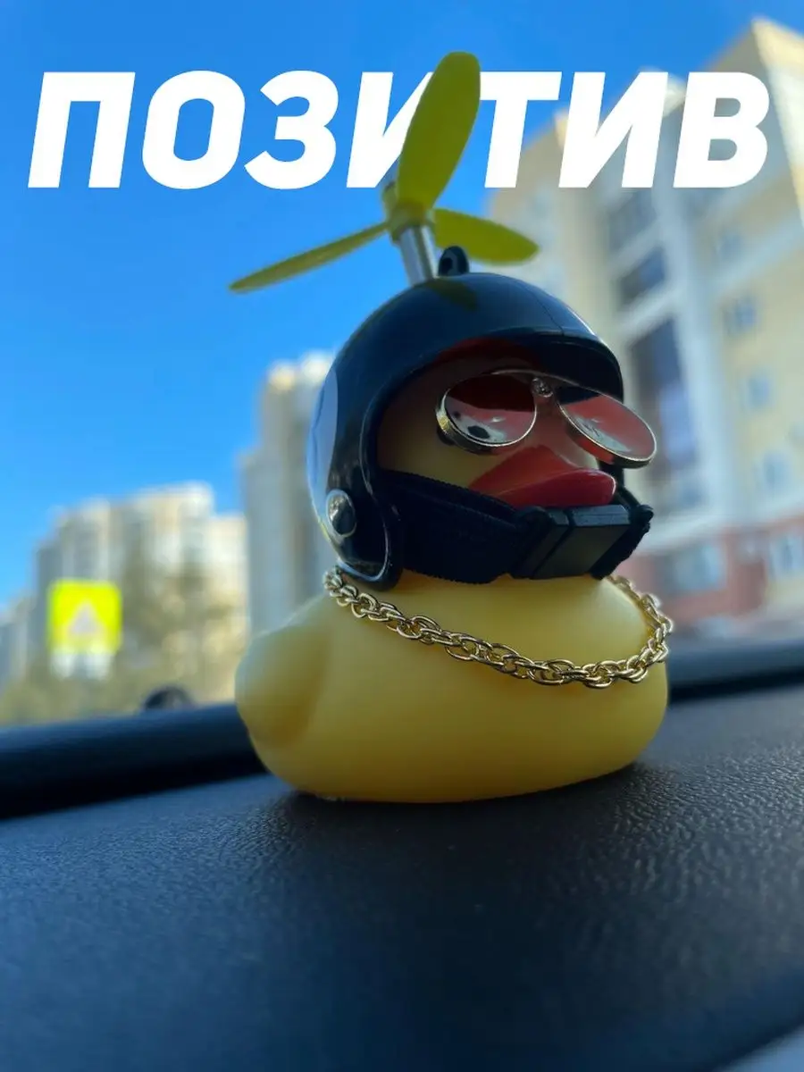 Описание: Уточка в машину - игрушка, которая взорвала Тик-Ток пространство. Оригинальный аксессуар в салон авто с подсветкой и прикольным писком стал звездой платформы и полюбился многим пользователям. Резиновая утка в шлеме - яркий автоаксессуар из высококачественной резины с набором множества дополнительных приколов в комплекте. По желанию можно надевать шлем с пропеллером, крутые солнцезащитные очки или золотую цепь. Все предметы надежно фиксируются на фигурке, не слетают даже при активной езде и встречном потоке ветра за счет крепления держателя. Пропеллер крутится на 360 градусов и привлекает к себе внимание. Игрушка отлично вписывается в любой салона автомобиля, станет креативным дополнением велосипеда самоката, руля или зеркала, послужит звоночком на мотоцикл и забавным тюнингом торпеды на присоске. Купить подарочную утку в автомобиль можно себе или в подарок. Такая оригинальная игрушка нравится не только молодежи и подросткам, но и взрослым. Цвет шлема можно выбрать самостоятельно из доступной палитры. Смешной утенок автоигрушка на панель будет прекрасным креативным мужским подарком любому мужчине: брату или папе, любимому парню или мужу, другу, начальнику и коллеге. На любой праздник, будь то день рождения, 23 февраля, 8 марта, новый год. Автомобильный шуточный сувенир и другие автотовары нашего магазина с юмором добавят атмосферы поездке. Игрушечные веселые желтые утята в каске набор декора для Вашего прекрасного настроения. Спасибо, что выбрали наши игрушки! Сыну, папе, маме или брату - это будет незаменимый подарок