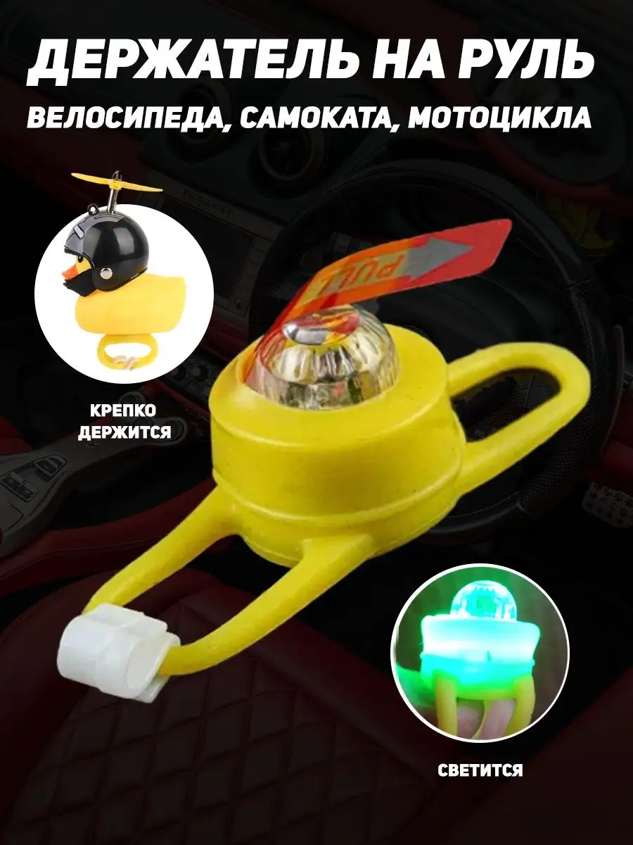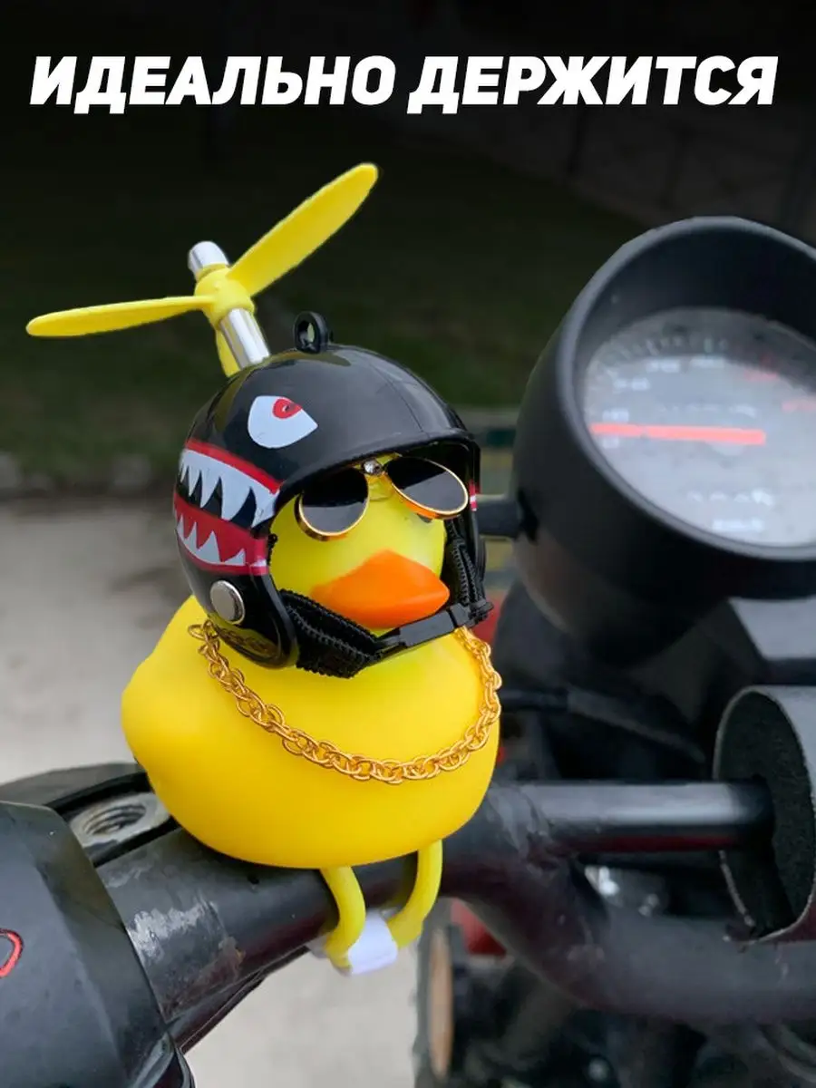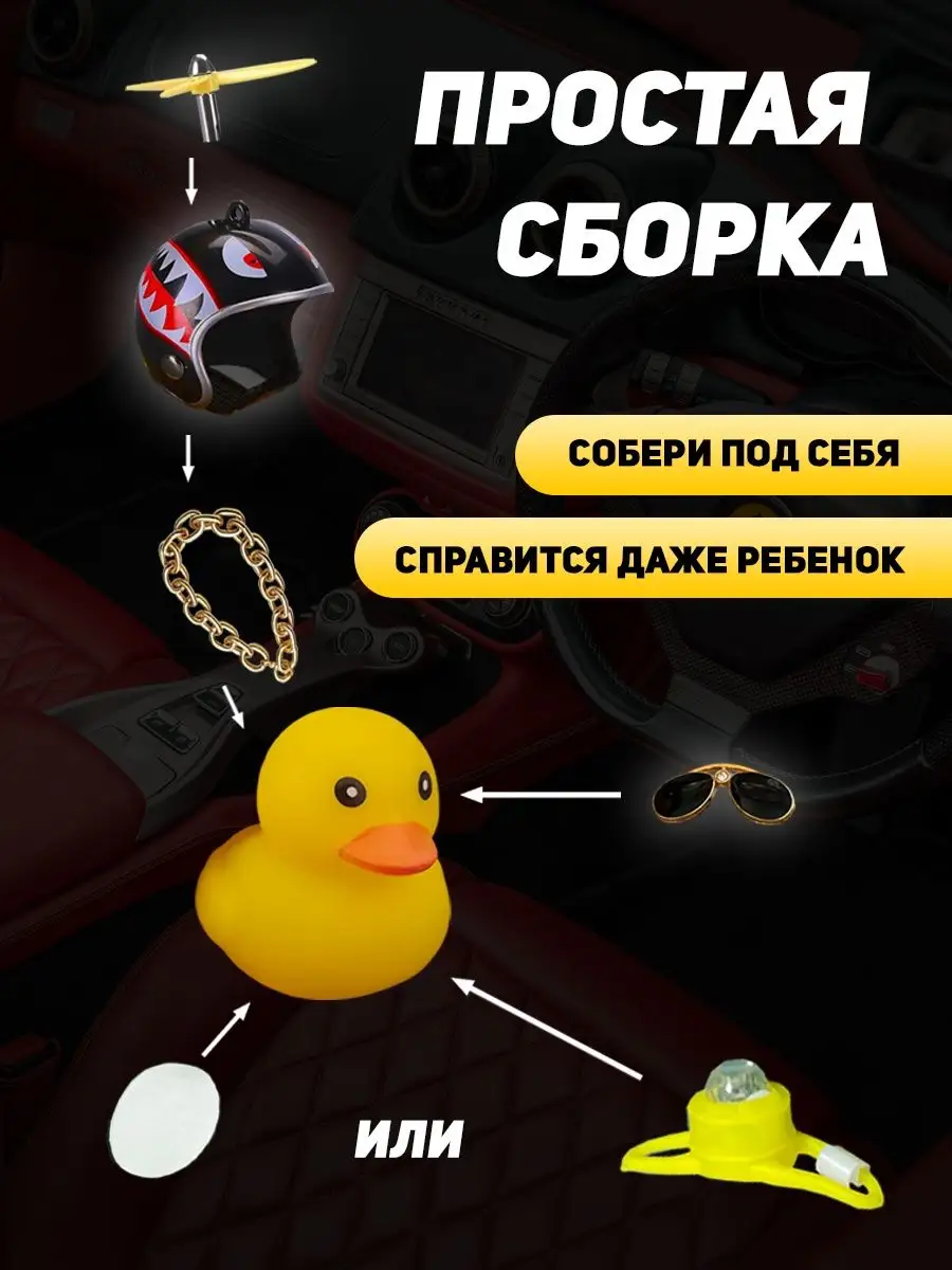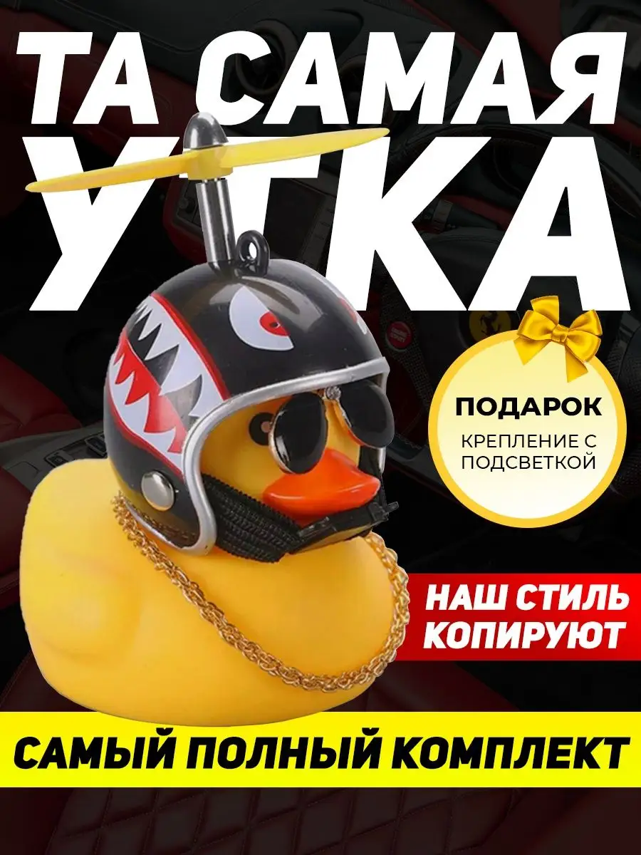 Описание: Уточка в машину - игрушка, которая взорвала Тик-Ток пространство. Оригинальный аксессуар в салон авто с подсветкой и прикольным писком стал звездой платформы и полюбился многим пользователям. Резиновая утка в шлеме - яркий автоаксессуар из высококачественной резины с набором множества дополнительных приколов в комплекте. По желанию можно надевать шлем с пропеллером, крутые солнцезащитные очки или золотую цепь. Все предметы надежно фиксируются на фигурке, не слетают даже при активной езде и встречном потоке ветра за счет крепления держателя. Пропеллер крутится на 360 градусов и привлекает к себе внимание. Игрушка отлично вписывается в любой салона автомобиля, станет креативным дополнением велосипеда самоката, руля или зеркала, послужит звоночком на мотоцикл и забавным тюнингом торпеды на присоске. Купить подарочную утку в автомобиль можно себе или в подарок. Такая оригинальная игрушка нравится не только молодежи и подросткам, но и взрослым. Цвет шлема можно выбрать самостоятельно из доступной палитры. Смешной утенок автоигрушка на панель будет прекрасным креативным мужским подарком любому мужчине: брату или папе, любимому парню или мужу, другу, начальнику и коллеге. На любой праздник, будь то день рождения, 23 февраля, 8 марта, новый год. Автомобильный шуточный сувенир и другие автотовары нашего магазина с юмором добавят атмосферы поездке. Игрушечные веселые желтые утята в каске набор декора для Вашего прекрасного настроения. Спасибо, что выбрали наши игрушки! Сыну, папе, маме или брату - это будет незаменимый подарок