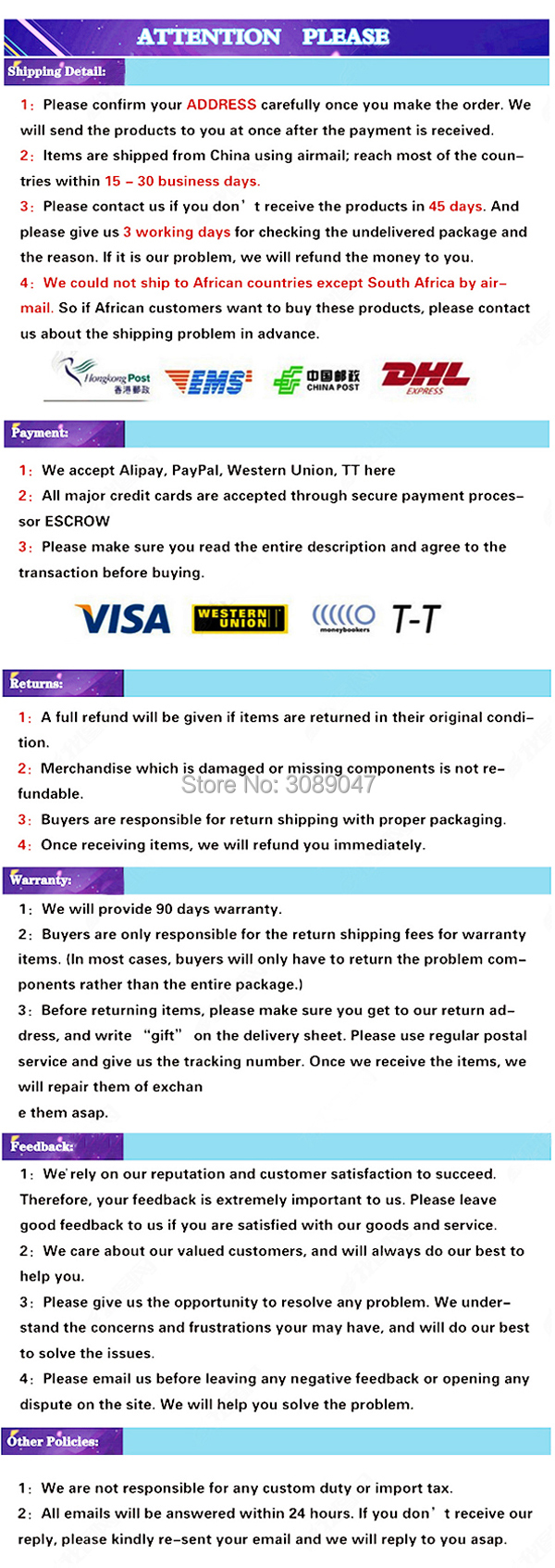 1.) Пожалуйста, подтвердите номер телефона и адрес доставки, который вы оставили, правильно при размещении заказа.