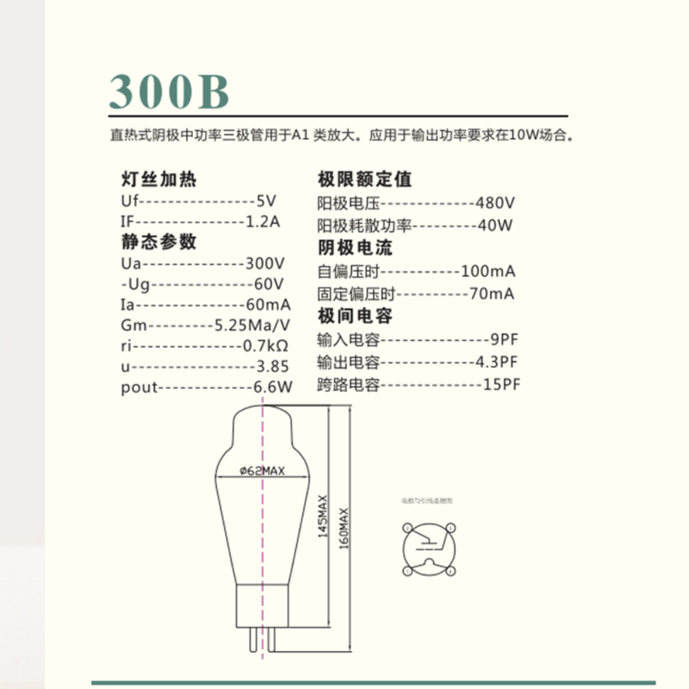 300B-L electronic tube is a direct heated cathode medium power triode used for Class A1 amplification. It is suitable for 10W output power in audio amplifier.