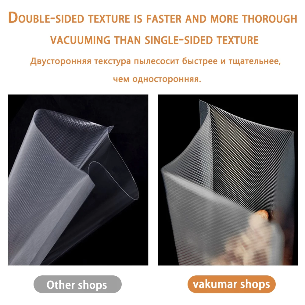 Двухсторонняя текстура для быстрого вакуумирования, высокопрочный материал сохраняет еду свежей и не замораживает ожоги или дегидрат.