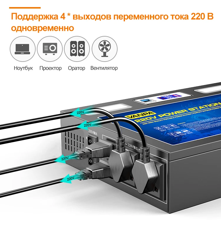 • Выходы для устройств питания: USB 5v, 12v DC и AC 220 вольт розетка