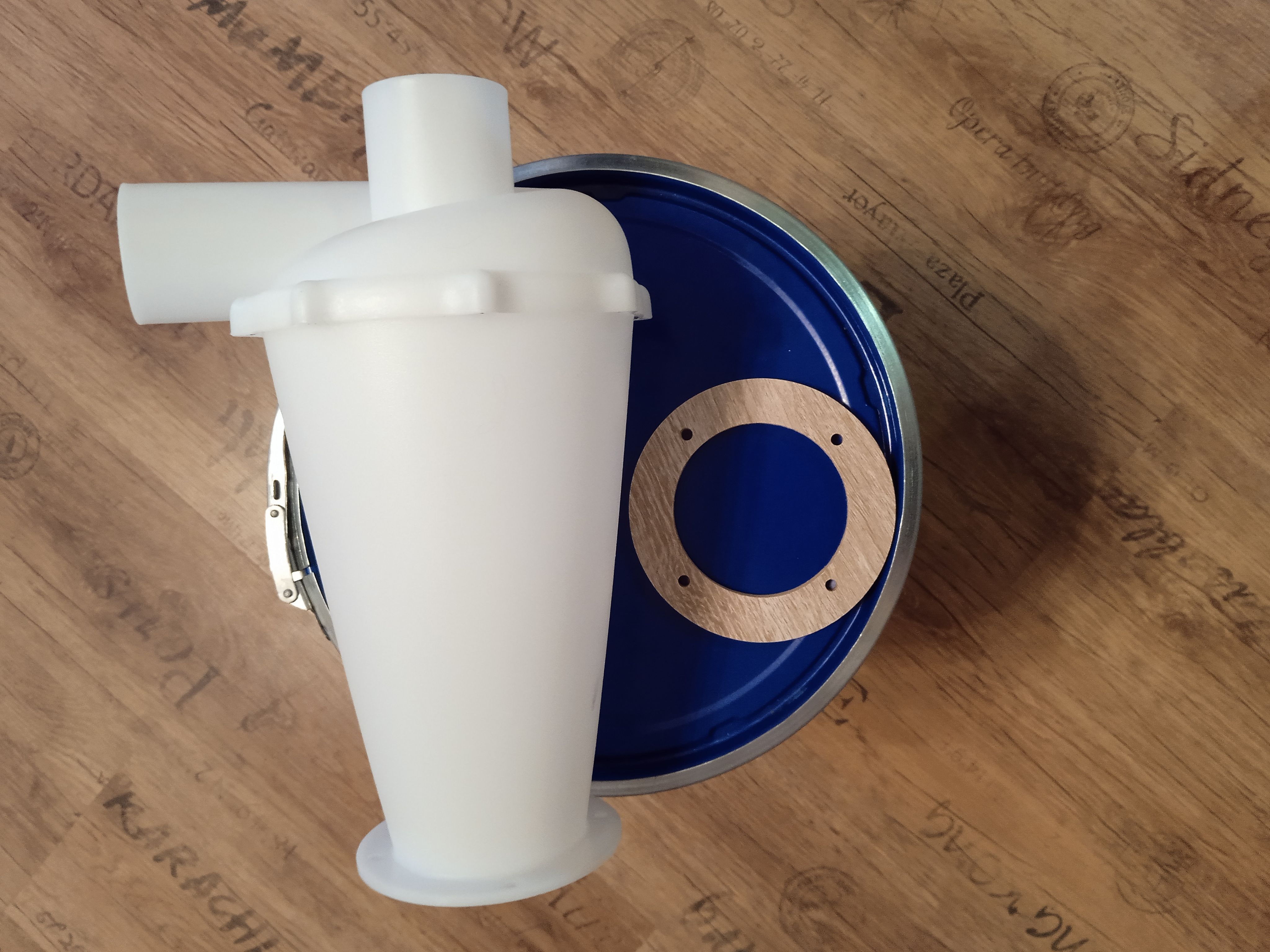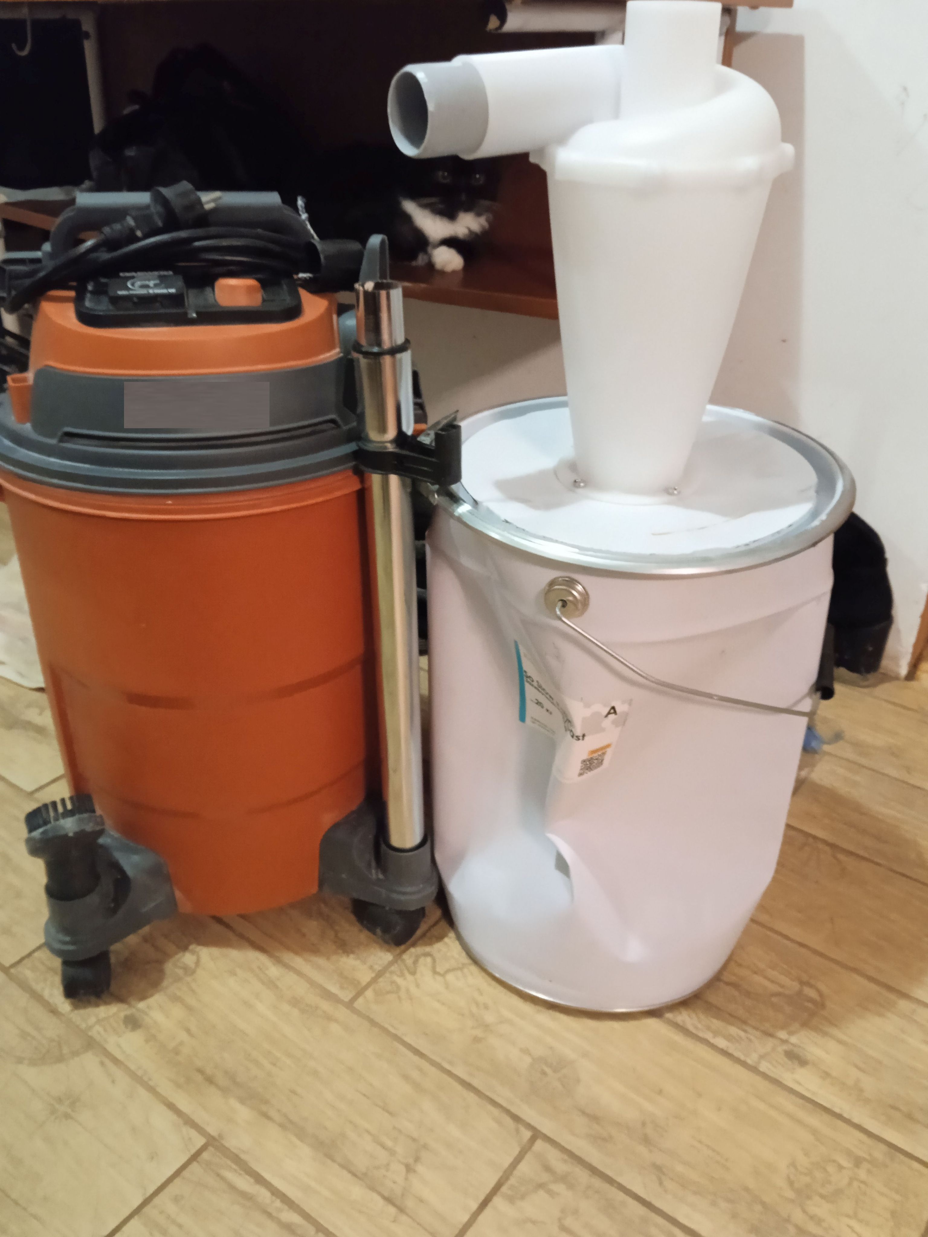 На одном из фото для примера дешевое ведро белого цвета с недостаточной толщиной металла 0,36мм, такое ведро схлопывается при перекрытии патрубка. Если у Вас уже есть циклон, но ваша емкость схлопнулась, это ведро будет достойной заменой, и уж точно проработает дольше Вашего пылесоса.