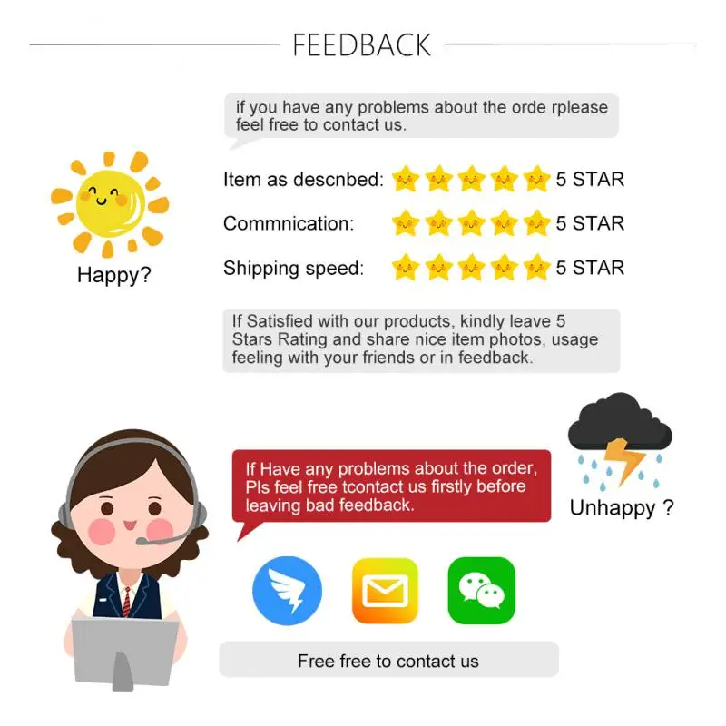 2. Если у вас есть какие-либо вопросы о продуктах или наших услугах, пожалуйста, свяжитесь с нами, прежде чем оставить отрицательный отзывы (пожалуйста, не открывайте спор в первую очередь). Мы сделаем все возможное, чтобы решить любые вопросы и предоставить Вам лучшее обслуживание клиентов.