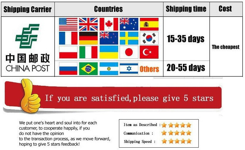 Если вам это нужно быстрее, мы можем предложить EMS, но вам нужно оплатить дополнительную стоимость доставки, как правило, $18 ~ 30. Согласно вашим товарам.