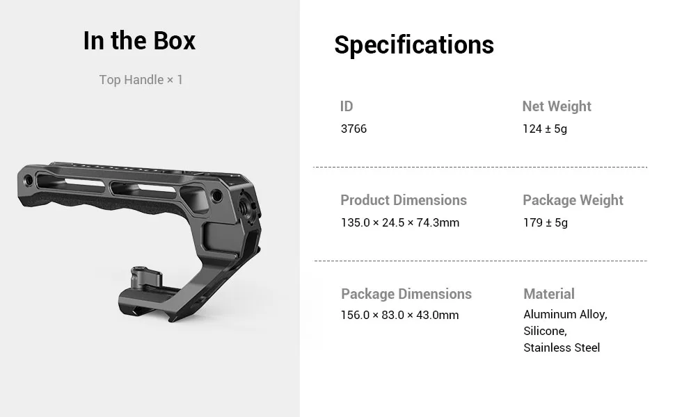 Верхняя ручка SmallRig NATO (Lite)3766 Предназначен для облегчения съемки под низким углом и уменьшения нагрузки на руки. Эргономичная ручка с противоскользящим и антифризовым силиконом, приятная на ощупь и весит всего 124 г из-за выдолбленной структуры. Он имеет 3 переднюю холодную обувь и 2 заднюю холодную обувь, которые позволяют одновременно устанавливать микрофон, светодиодный светильник, монитор и другие аксессуары. Поддержка отверстий ARRI 3/8 " -16 Крепление для монитора 29032348 Для подключения мониторов; 1/4 "-20 резьбовых отверстий2070 Magic Arm Для мониторов и Пульт дистанционного управления 2924 Для записи. Его быстроразъемный зажим NATO подходит для всех стандартных рельсов NATO.