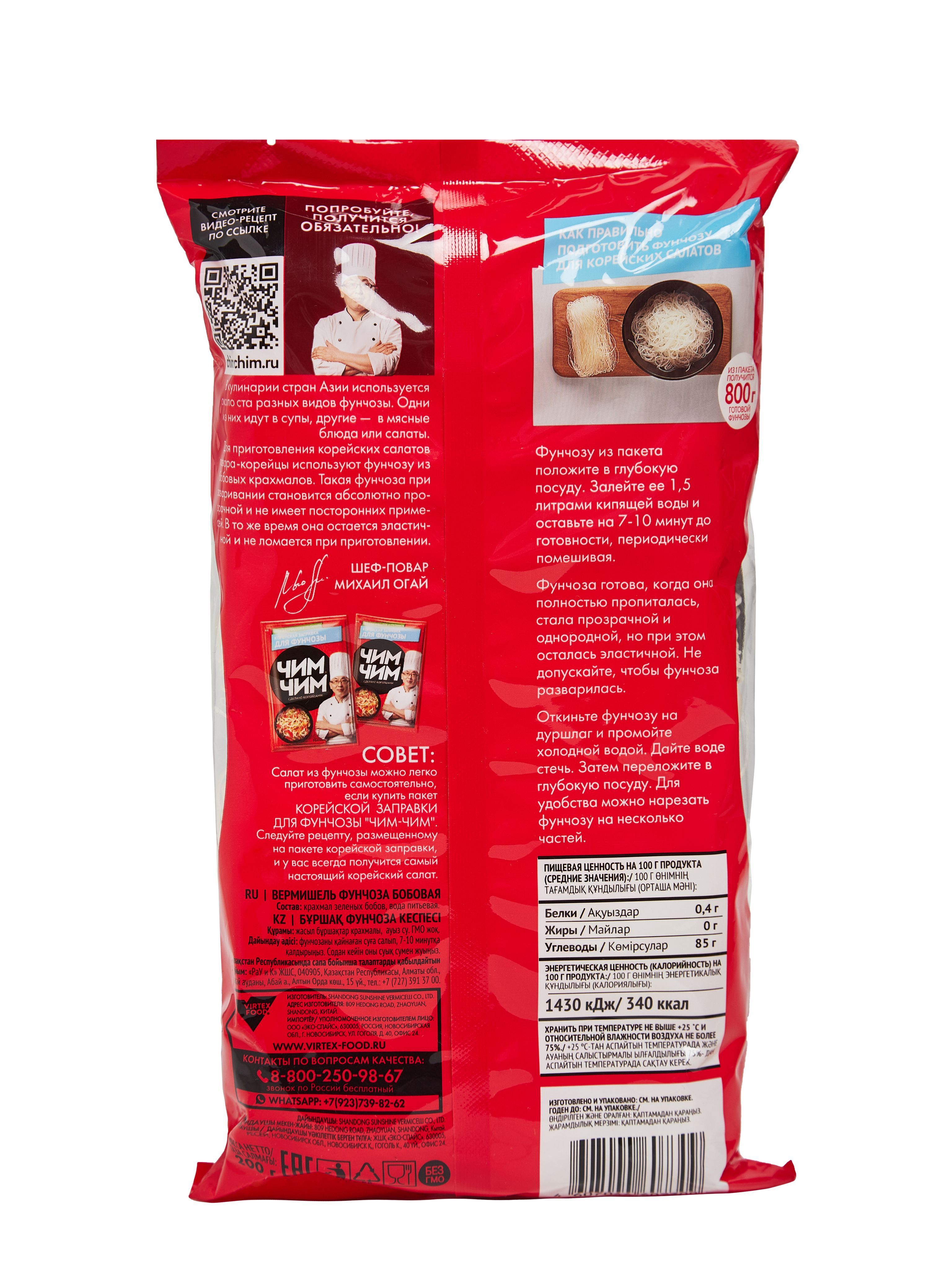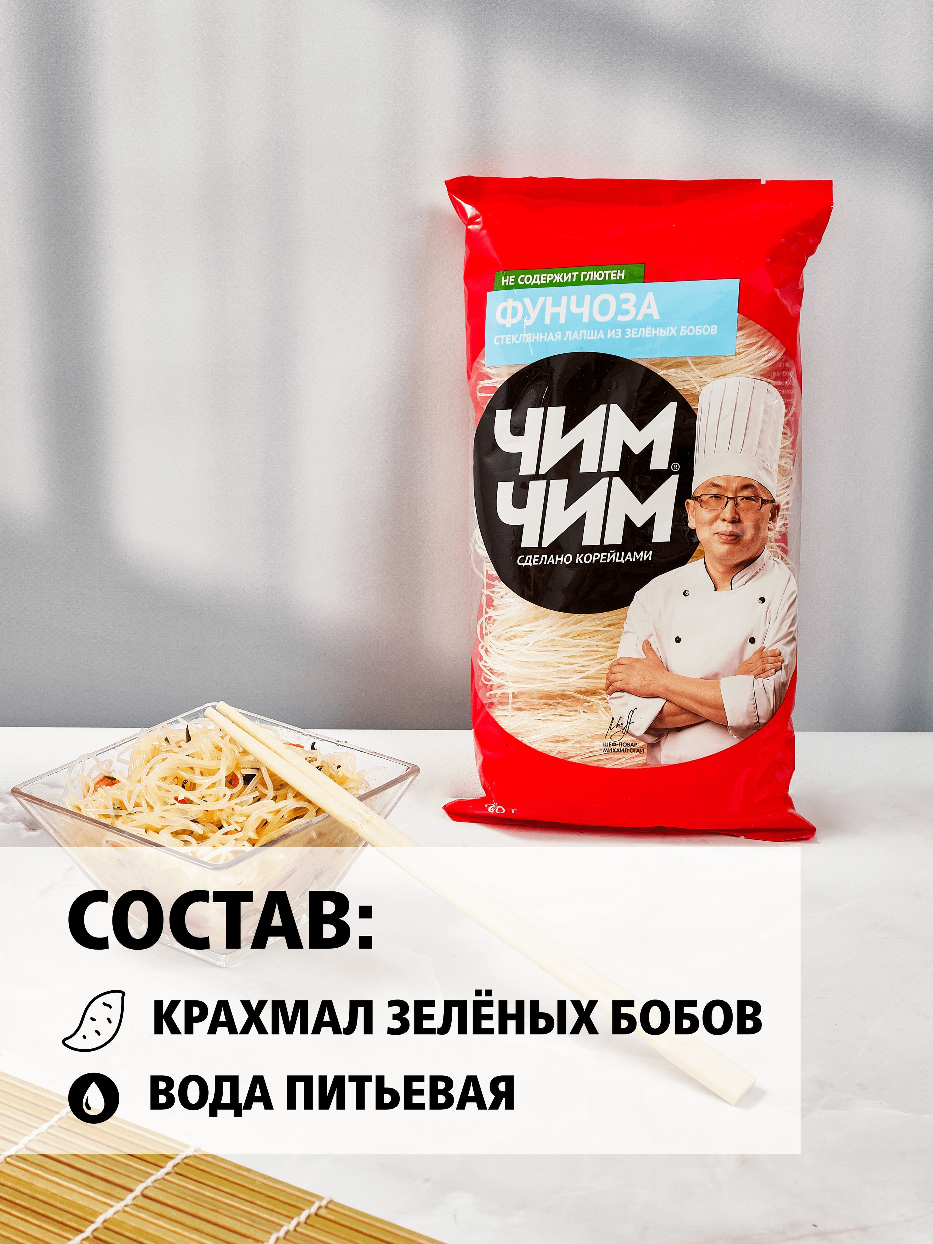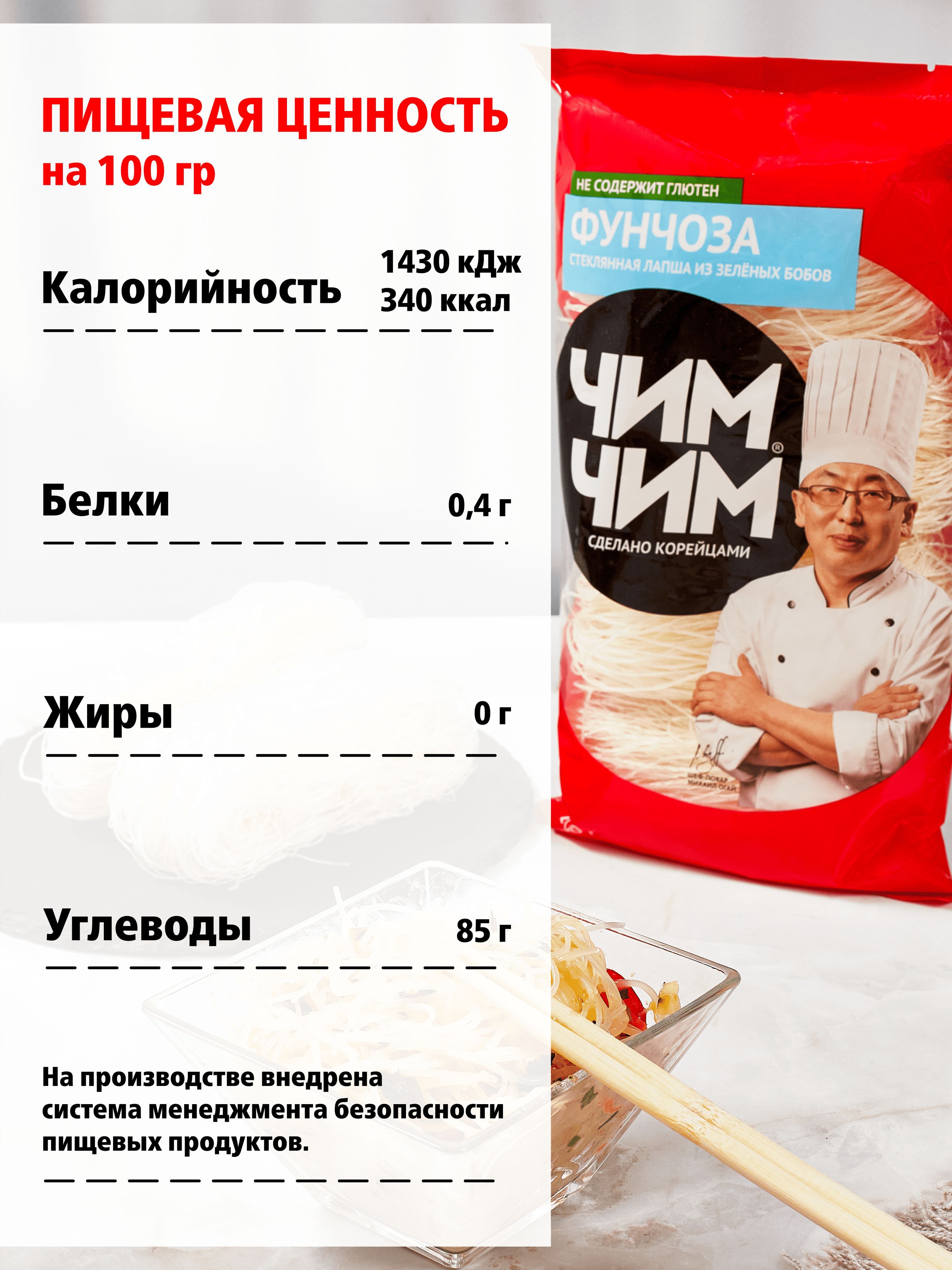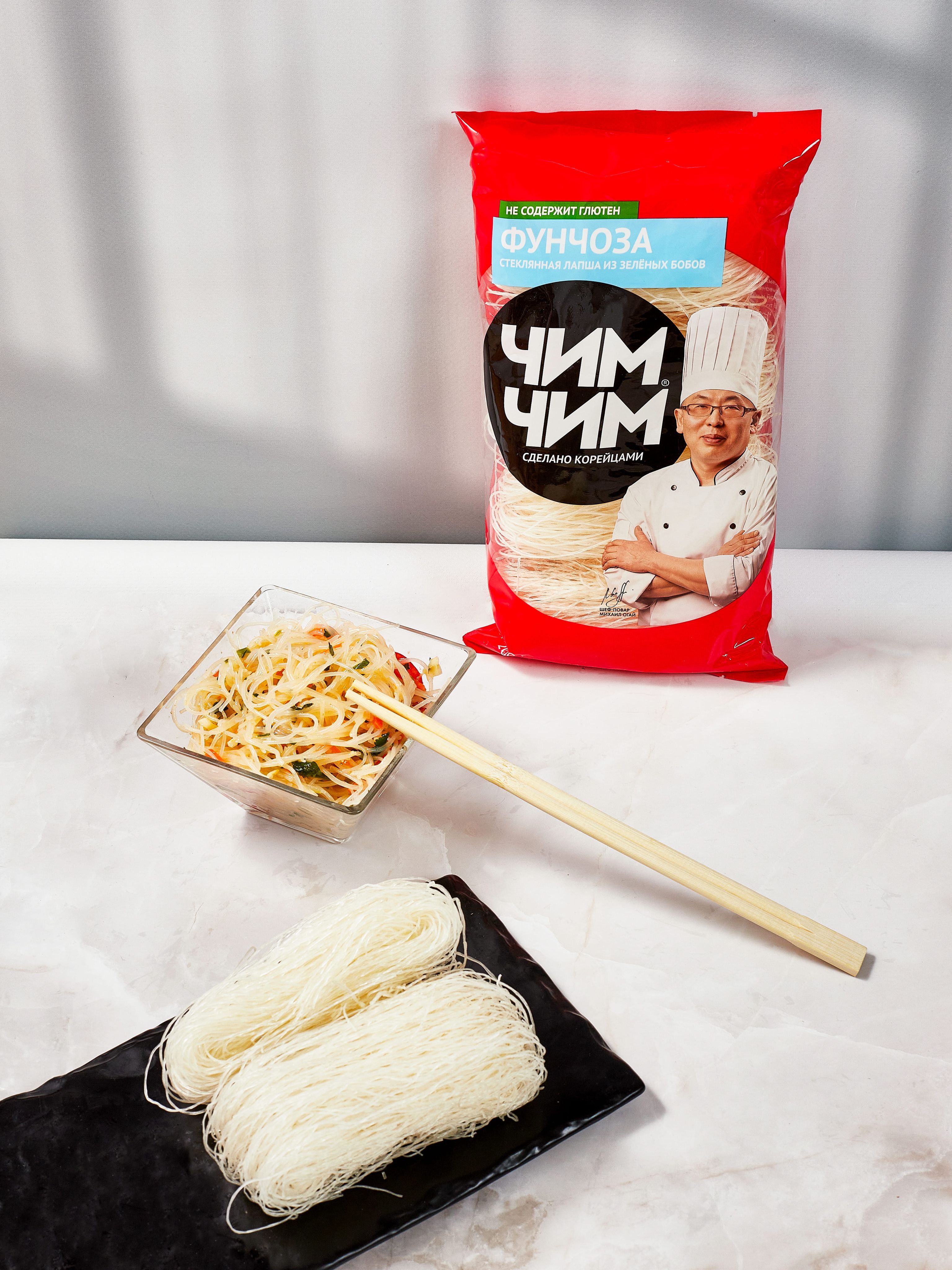 Описание: Фунчоза - это вермишель из бобовой муки. Она широко распространена и популярна в Корее, Китае, Японии, Индии и Вьетнаме. Бобовая вермишель прекрасно сочетается с овощами и мясом в горячих блюдах и супах, а также является основной для знаменитого салата по-корейски Фунчоза, столь полюбившегося россиянам.