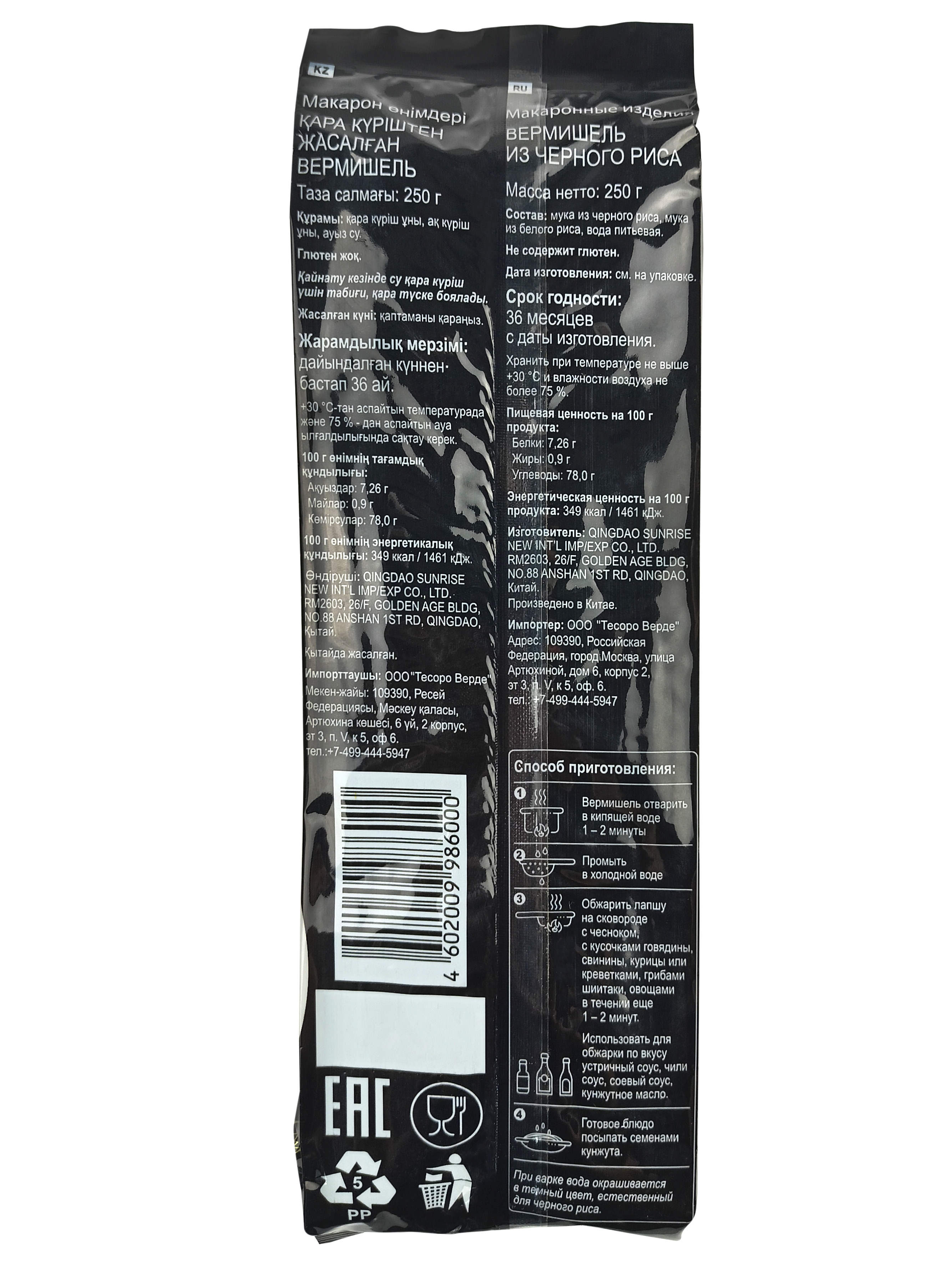 Черный рис содержит витамины группы В, железо, магний, цинк и другие минералы. У черного риса низкий гликемический индекс, поэтому блюда из него не вызывают резкого повышения уровня сахара в крови. Употребление вермишели из черного риса оказывает благоприятное воздействие на состояние кожи, нервную и сердечно-сосудистую системы, пищевые волокна способствуют нормализации пищеварения, а белки дают быстрое чувство насыщения.