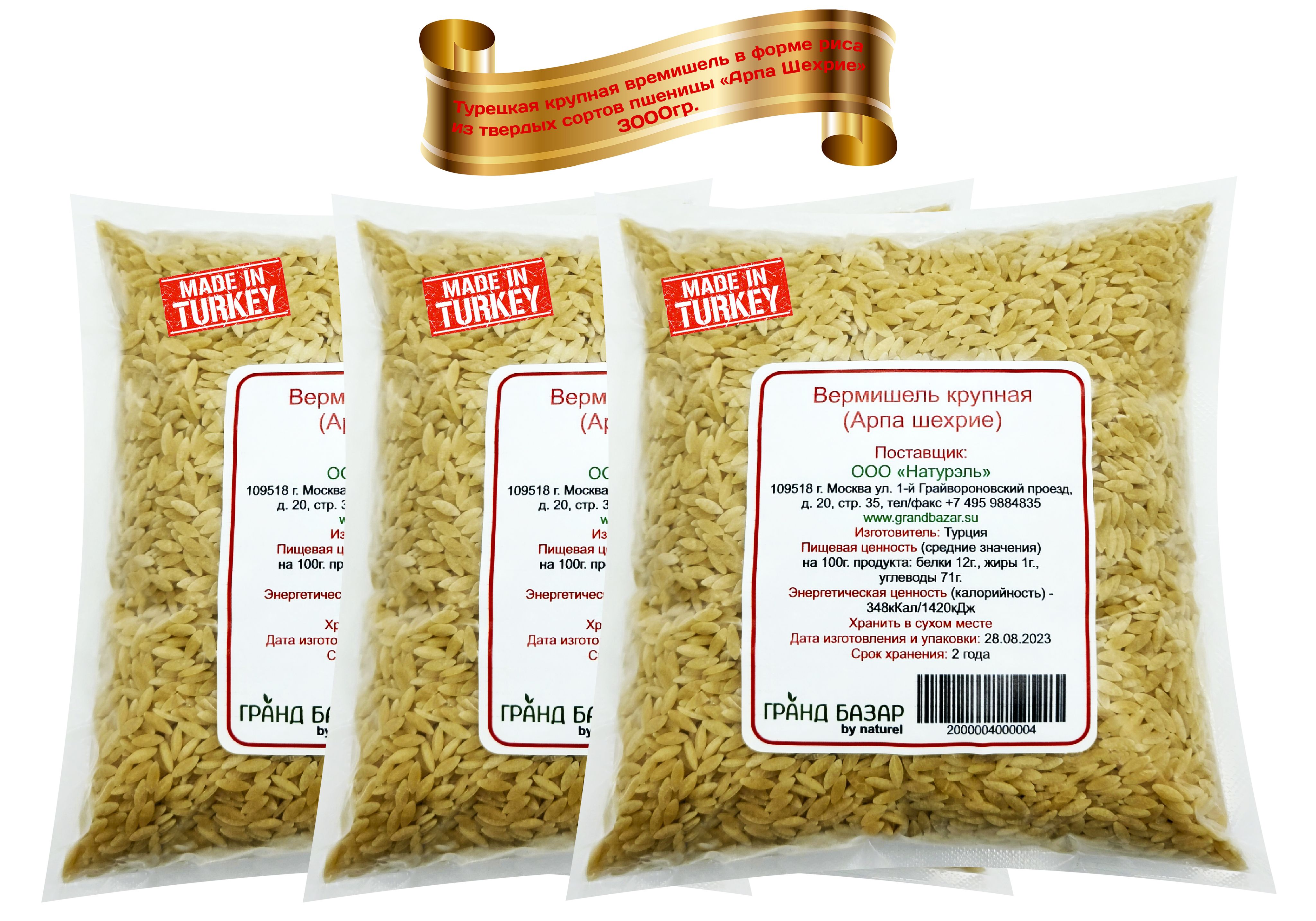 Описание: Арпа шехрие/Орзо (крупная вермишель в форме рисовых зерен) 3000гр. (3 пакета по 1кг.) от крупного импортера товаров из турции компании "Гранд Базар by Naturel"
