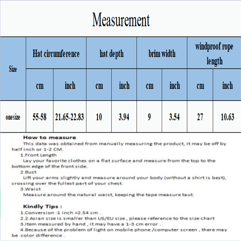 Окружность шляпы: 55-58 см Глубина шляпы: 10 см Ширина полей: 9 см Длина ветрозащитной веревки: 27 см
