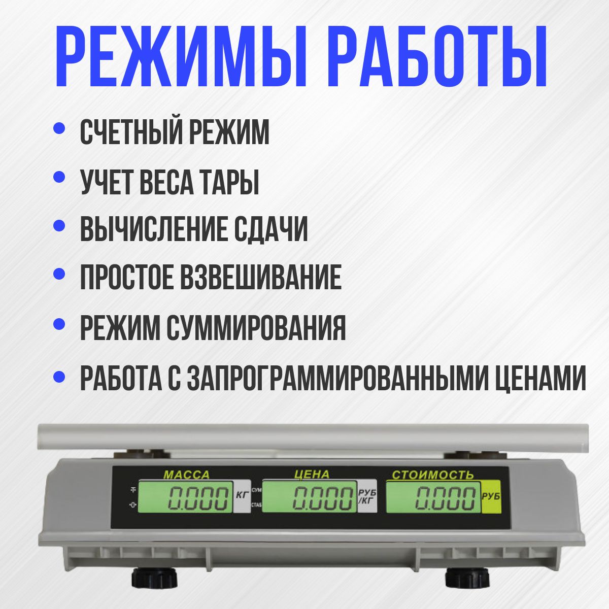 Режимы работыПростое взвешивание; Счетный режим; Работа с запрограммированными ценами; Вычисление сдачи; Режим суммирования; Учет веса тары