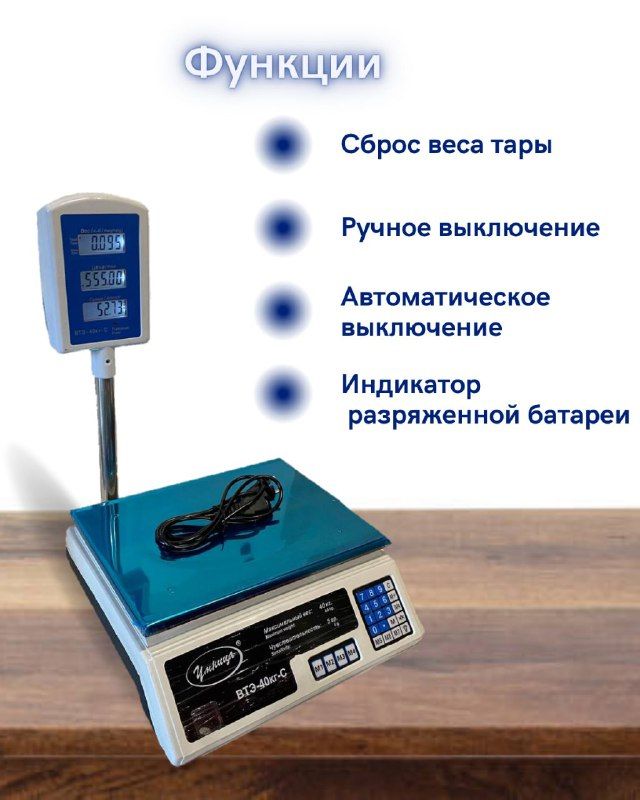 • - Весы имеют два разнонаправленных светодиодных LED дисплея для продавца и покупателя, отображающих вес, цену за единицу товара и сумму к оплате.