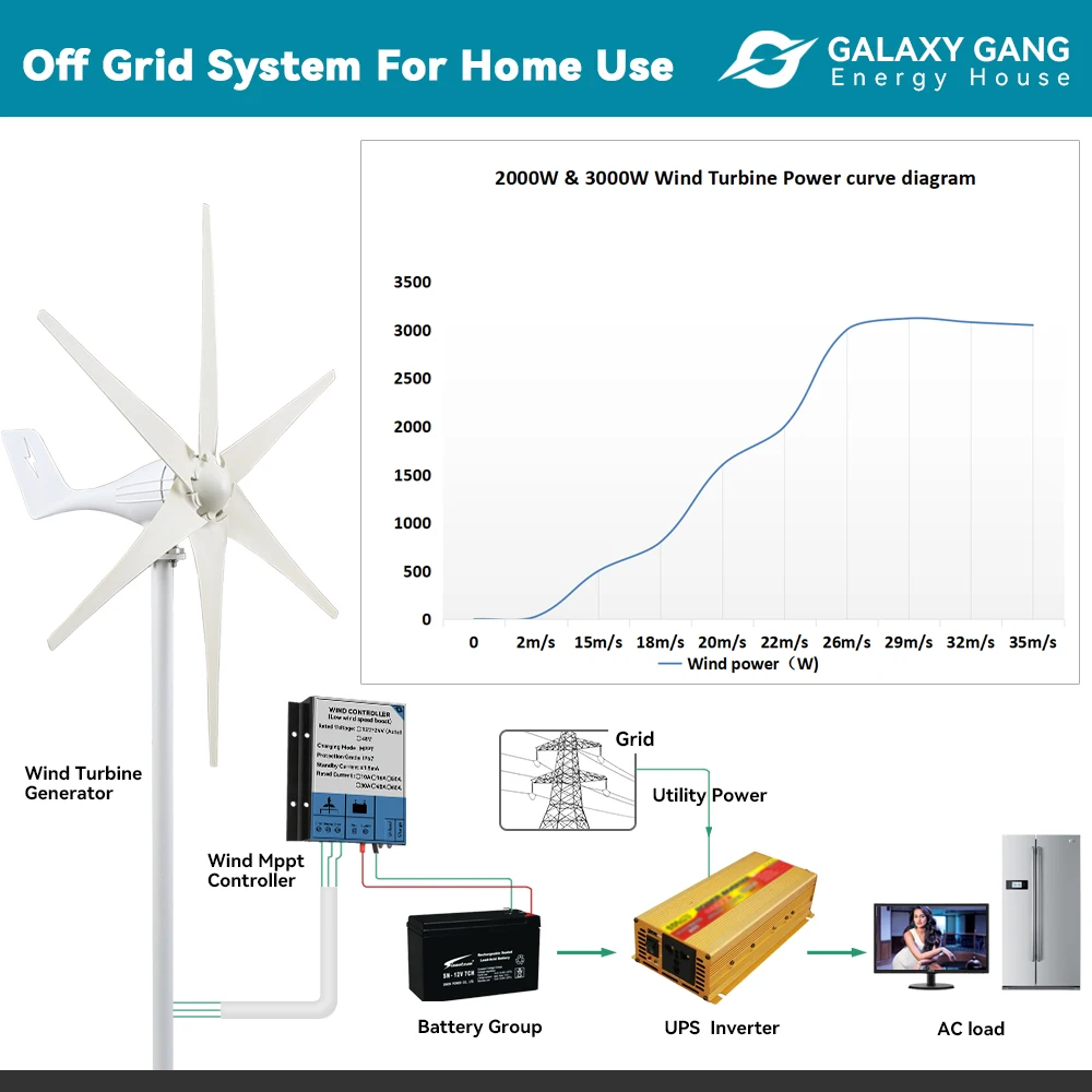 Небольшая ветряная турбина Свободная энергия 3 кВт 3000 Вт 12 В 24 В 48 В 6 лопастей с MPPT/контроллером заряда Ветряные мельницы RV Yacht Farm для домашнего использования