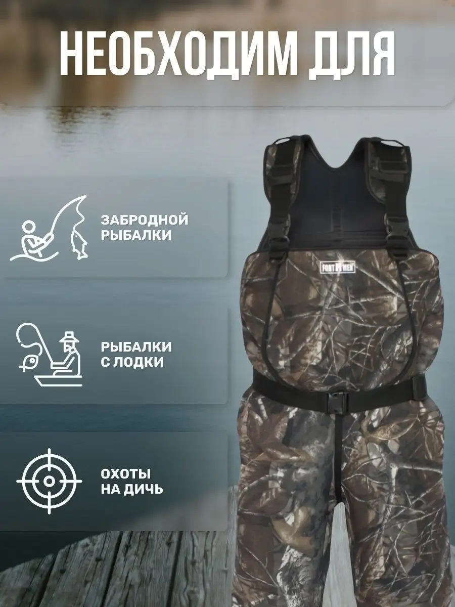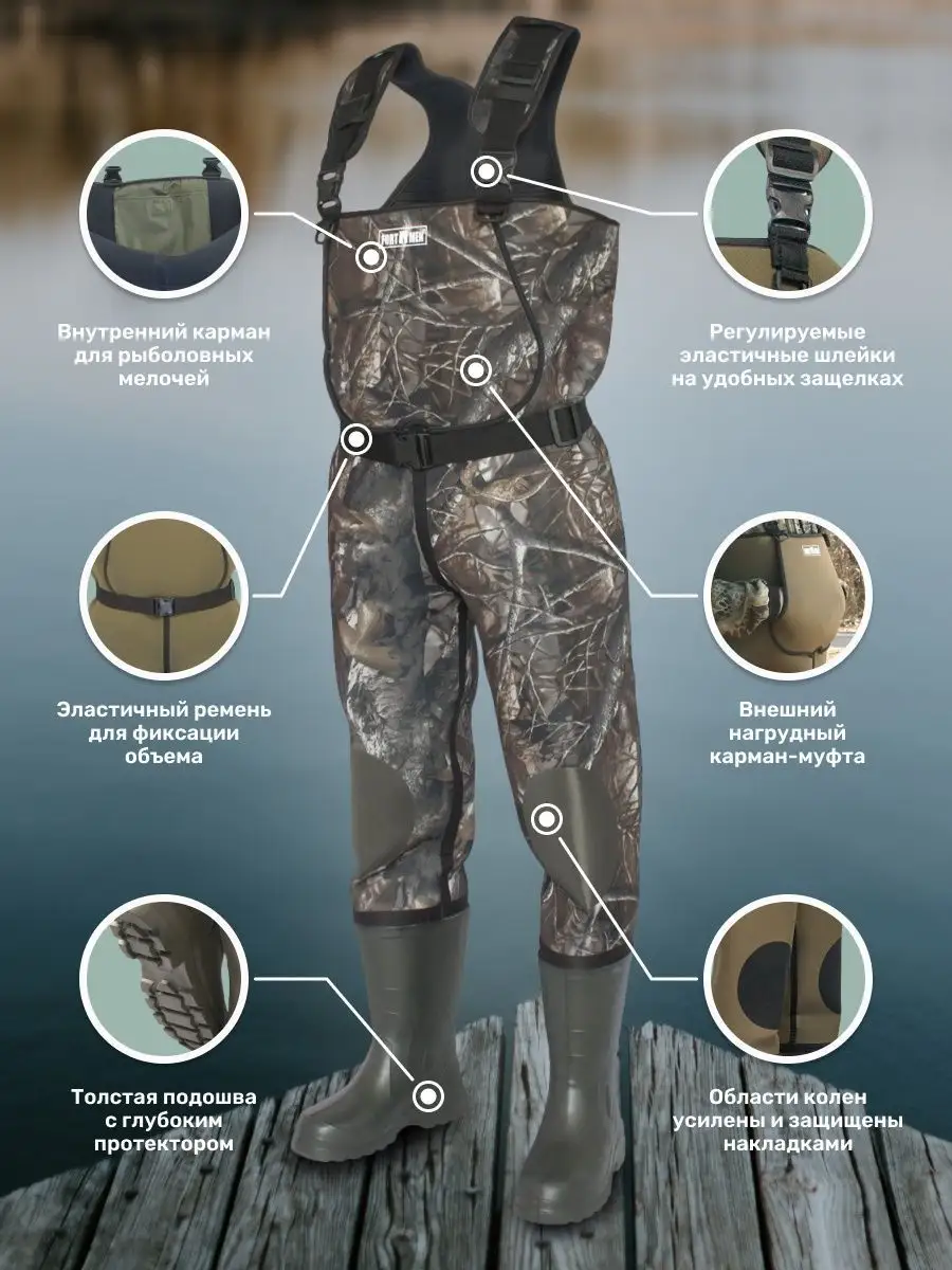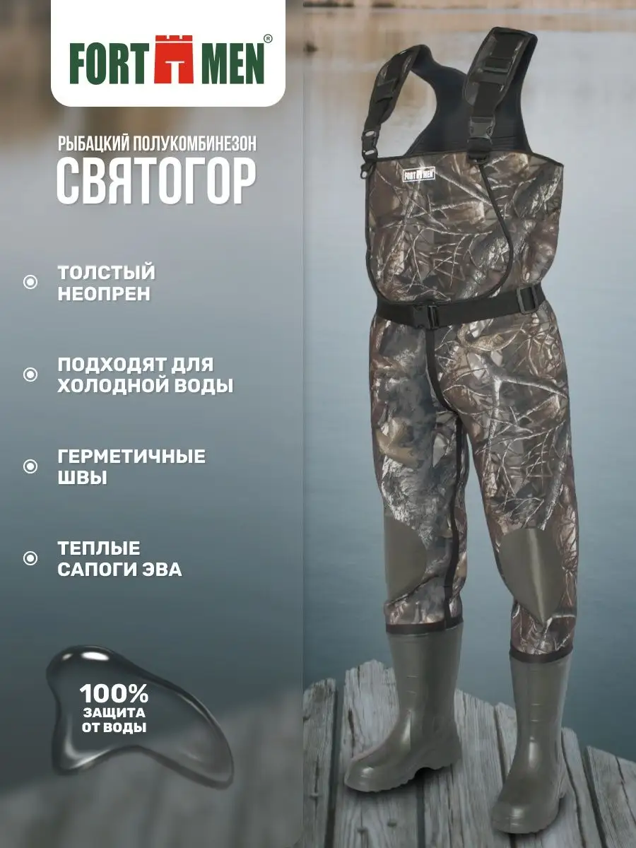 Описание: СВЯТОГОР - серия забродной рыбацкой экипировки из неопрена для комфортной забродной рыбалки в холодной воде, вплоть до 0С. Благодаря толщине неопрена в 4,5-5 мм, забродный костюм СВЯТОГОР существенно дольше сохраняет тепло в холодной воде в сравнении с аналогичными изделиями из неопрена. Неопрен водонепроницаем и устойчив к перепадам температур, сохраняет свою эластичность и потребительские свойства. К полукомбинезону технологичным способом, обеспечивающим герметичность, прикреплены сапоги из ЭВА. По своей пористой структуре ЭВА сапоги схожи с неопреном, поэтому так же хорошо сохраняют тепло. В большом наружном кармане, который выполнен в виде муфты, удобно согреть руки или расположить рыболовные аксессуары. Так же в области груди имеется внутренний карман на замке, для хранения документов, телефона. В комплекте к вейдерсам предусмотрен ремень для фиксации полукомбинезона по талии. Области колен продублированы прочными накладками с прорезиненным покрытием, для защиты от истирания и повреждений, т. к. эти места наиболее уязвимы, особенно при частых опорах на колено либо преодоления густых зарослей. Шлейки снабжены удобными застежками, которые легко расстегнуть нажатием одной руки. Размер вейдерсов необходимо подбирать согласно размерной таблице производителя, расположенной среди фотографий. При использовании сапог с вкладными утеплителями, что обязательно рекомендуется делать в холодной воде, необходимо выбирать вейдерсы с сапогами на один размер больше своего размера обуви. Вкладные утеплители в комплекте не предусмотрены. Забродники для рыбалки. Забродный комбинезон. Забродный костюм.
