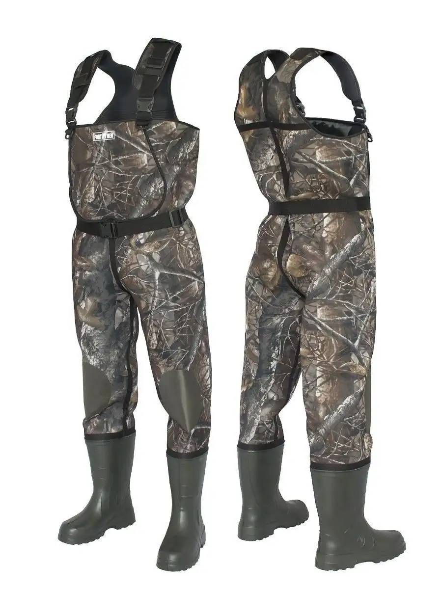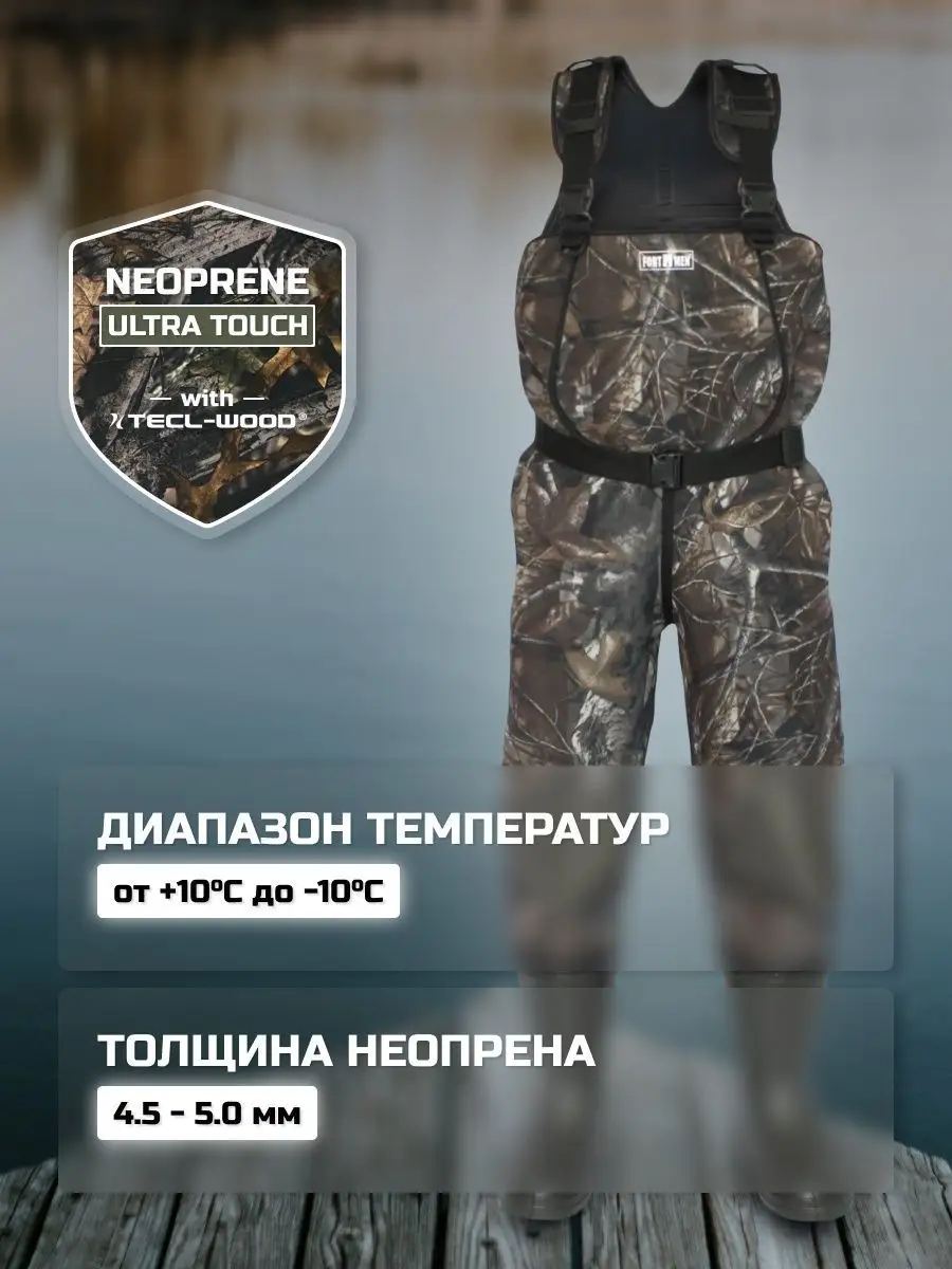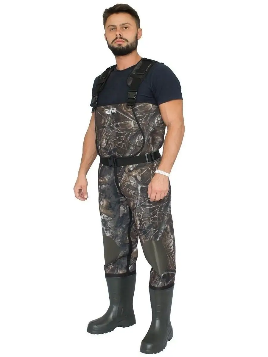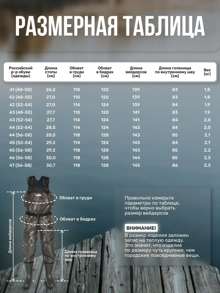 Описание: СВЯТОГОР - серия забродной рыбацкой экипировки из неопрена для комфортной забродной рыбалки в холодной воде, вплоть до 0С. Благодаря толщине неопрена в 4,5-5 мм, забродный костюм СВЯТОГОР существенно дольше сохраняет тепло в холодной воде в сравнении с аналогичными изделиями из неопрена. Неопрен водонепроницаем и устойчив к перепадам температур, сохраняет свою эластичность и потребительские свойства. К полукомбинезону технологичным способом, обеспечивающим герметичность, прикреплены сапоги из ЭВА. По своей пористой структуре ЭВА сапоги схожи с неопреном, поэтому так же хорошо сохраняют тепло. В большом наружном кармане, который выполнен в виде муфты, удобно согреть руки или расположить рыболовные аксессуары. Так же в области груди имеется внутренний карман на замке, для хранения документов, телефона. В комплекте к вейдерсам предусмотрен ремень для фиксации полукомбинезона по талии. Области колен продублированы прочными накладками с прорезиненным покрытием, для защиты от истирания и повреждений, т. к. эти места наиболее уязвимы, особенно при частых опорах на колено либо преодоления густых зарослей. Шлейки снабжены удобными застежками, которые легко расстегнуть нажатием одной руки. Размер вейдерсов необходимо подбирать согласно размерной таблице производителя, расположенной среди фотографий. При использовании сапог с вкладными утеплителями, что обязательно рекомендуется делать в холодной воде, необходимо выбирать вейдерсы с сапогами на один размер больше своего размера обуви. Вкладные утеплители в комплекте не предусмотрены. Забродники для рыбалки. Забродный комбинезон. Забродный костюм.