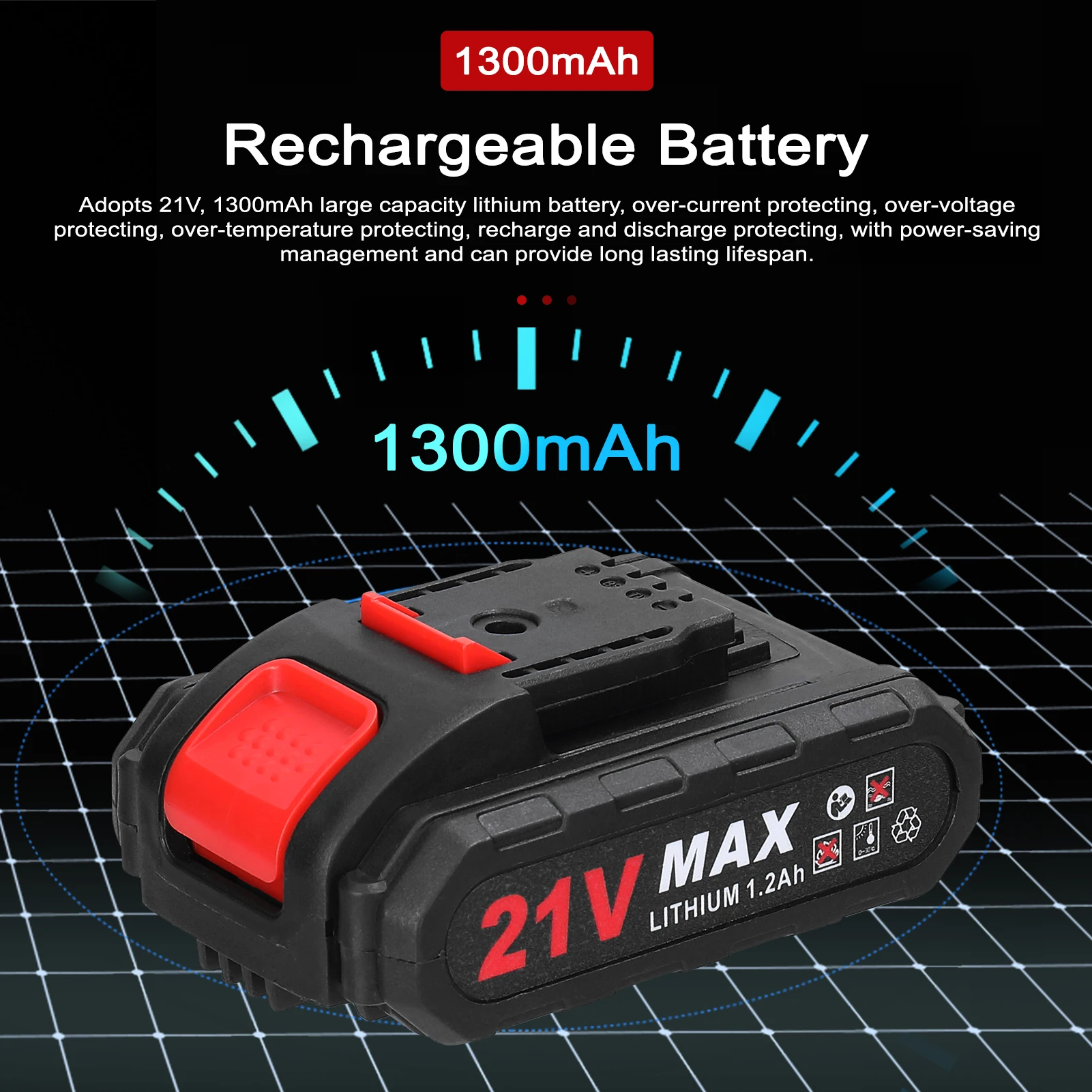 Аккумуляторная Батарея:Принимает литиевую батарею большой емкости 21 В, 1300 мАч, защиту от перегрузки по току, защиту от перенапряжения, защиту от перегрева, защиту от перезарядки и разряда, с энергосберегающим управлением и может обеспечить длительный срок службы.