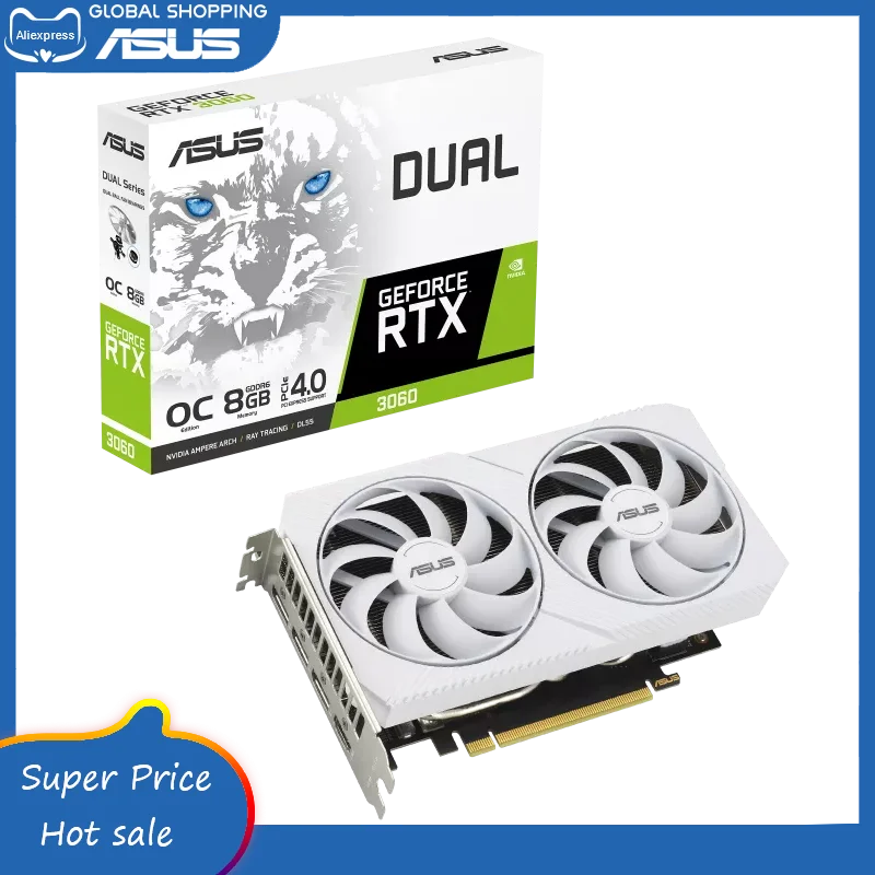 ASUS DUAL GeForce RTX3060-O8G-WHITE OC Edition 8GB GDDR6 с двумя мощными вентиляторами с технологией Axial и 2-слотовым дизайном для широкой совместимости