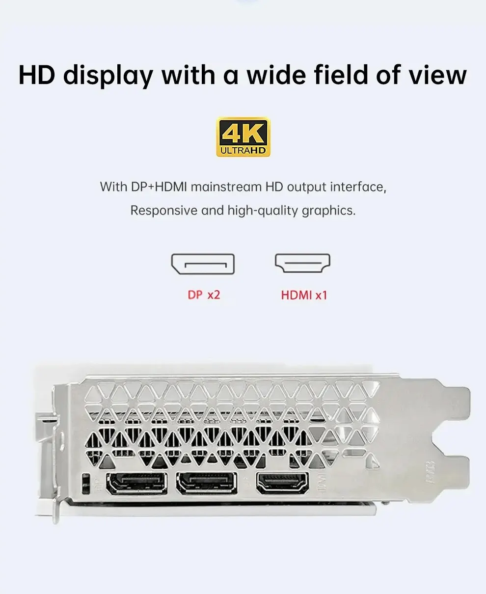 • Двойная вентиляторная Система охлаждения:Система охлаждения с двумя вентиляторами обеспечивает эффективный отвод тепла, обеспечивая охлаждение видеокарты и бесперебойную работу даже во время интенсивных игровых сессий.