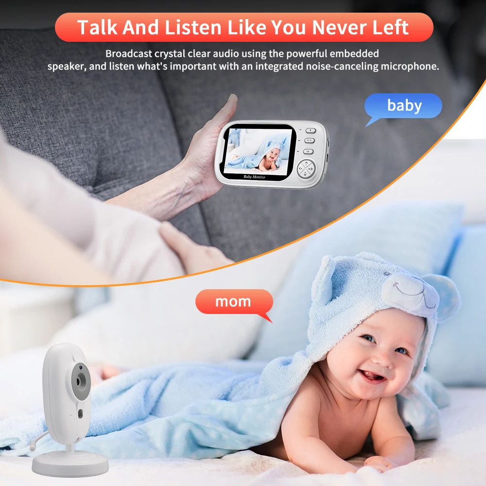 * Двусторонний голосовой домофон в реальном времени, теперь вы можете слышать голос ребенка на расстоянии, а также можете разговаривать со своим ребенком по другую сторону монитора.