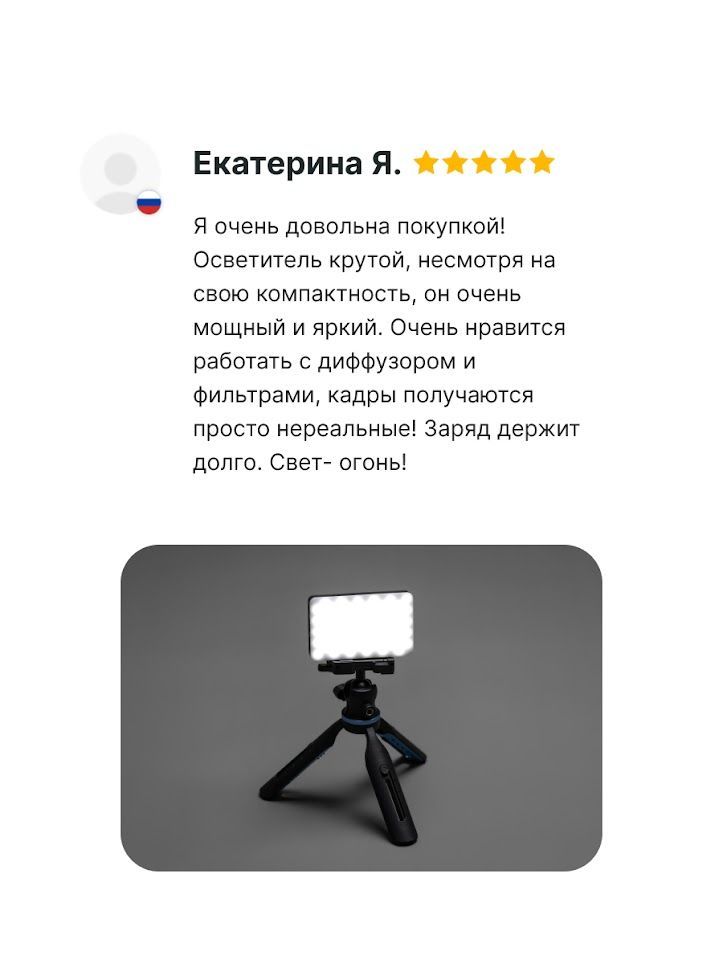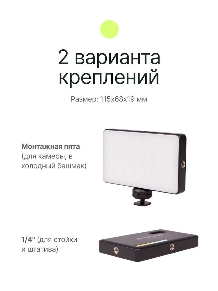 Описание: Raylab LED08BI-2 - мобильный светодиодный осветитель- незаменимый инструмент для блогеров, фотографов и видеоконференций. Накамерный осветитель Raylab LED08BI-2 обладает уникальными возможностями, чтобы вы могли создавать идеальное освещение для каждой задачи. Используя 160 светодиодов, расположенных под матовой белой панелью, вы получите мягкий и ровный свет. Возможность плавно регулировать мощность света от 1% до 100% и изменять цветовую температуру в диапазоне от 2500K до 6500K позволят адаптировать осветитель под любую сцену и добиться желаемого эффекта на ваших фотографиях или видеоконференциях. Raylab LED08BI-2 создан для длительных съемок и конференций. Встроенный Li-Ion аккумулятор емкостью 3100mAh обеспечивает непрерывную работу видеосвета от 2 до 15 часов, что позволит вам сосредоточиться на творчестве без лишних прерываний. Эта световая панель легко устанавливается на оборудование с помощью 1/4'' крепления или холодного башмака. Вы сможете легко установить мини свет на стойку, башмак камеры или штатив. Для того чтобы вы могли создавать яркие и креативные кадры, в набор осветителя включены цветные фильтры и силиконовая накладка. Эти аксессуары позволят создать мягкий неоновый, rgb или цветной свет, тем самым добавить особый шарм в каждый снимок. Селфи лампа Raylab LED08BI-2 - отличное решение для путешествий. Эта цветная лампа способна создать отличное настроение на празднике вечеринке и поможет сохранить самые яркие моменты вашей жизни.