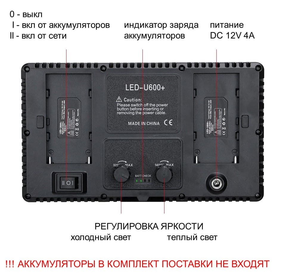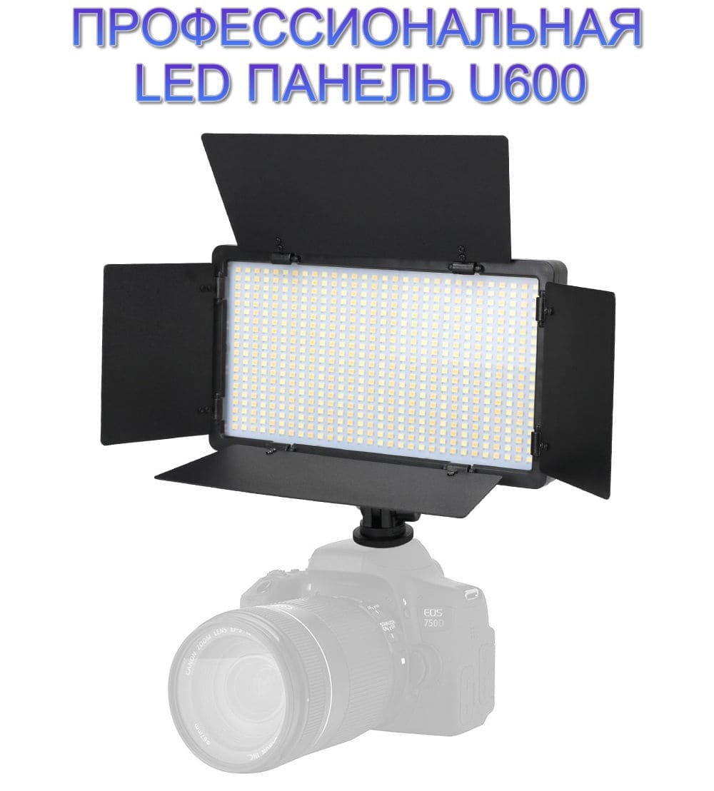 Видеосвет U600, Блок питания DC 12V 4A, Холодный башмак с резьбой 1/4, Настольный штатив - рукоятка