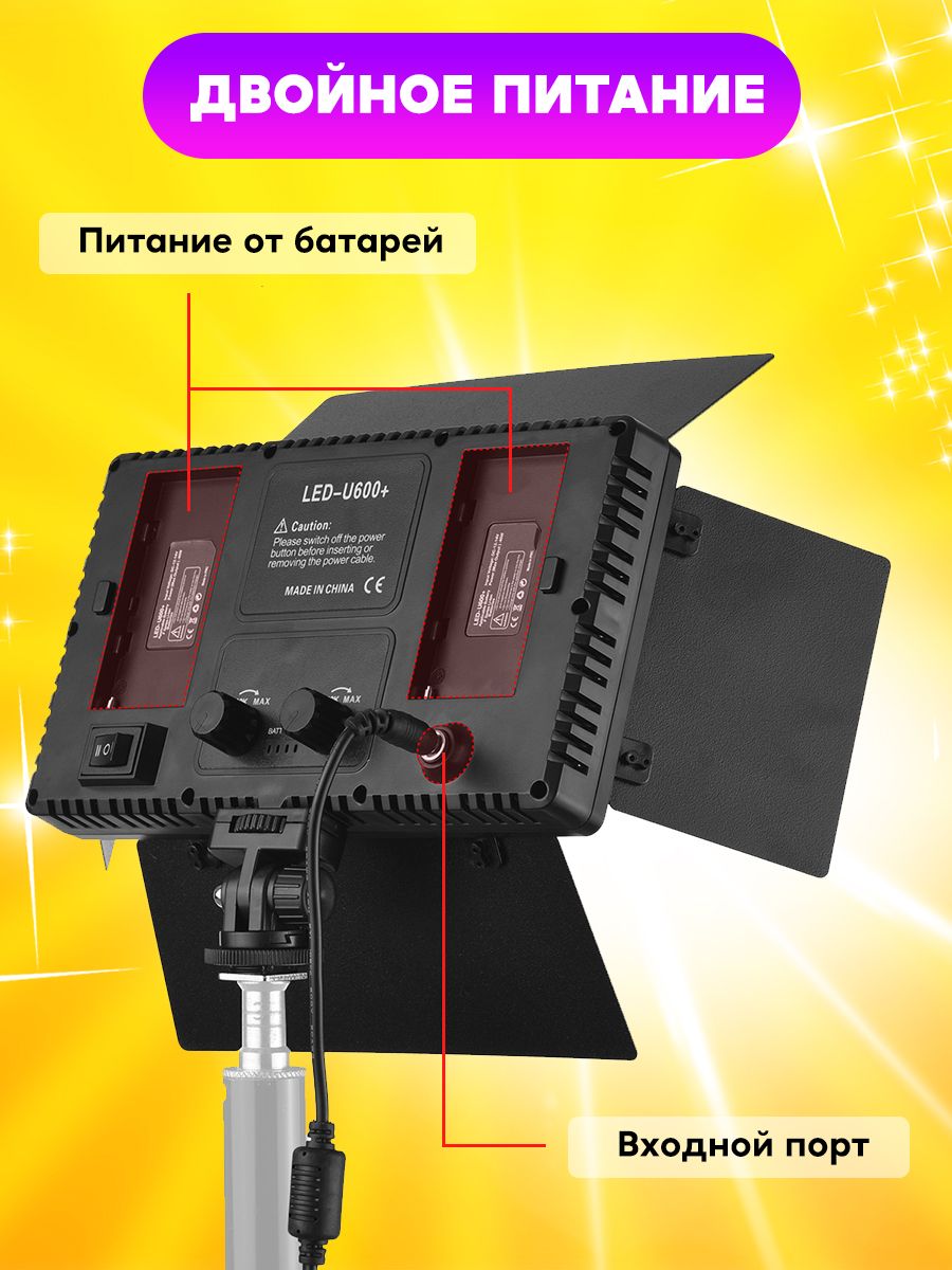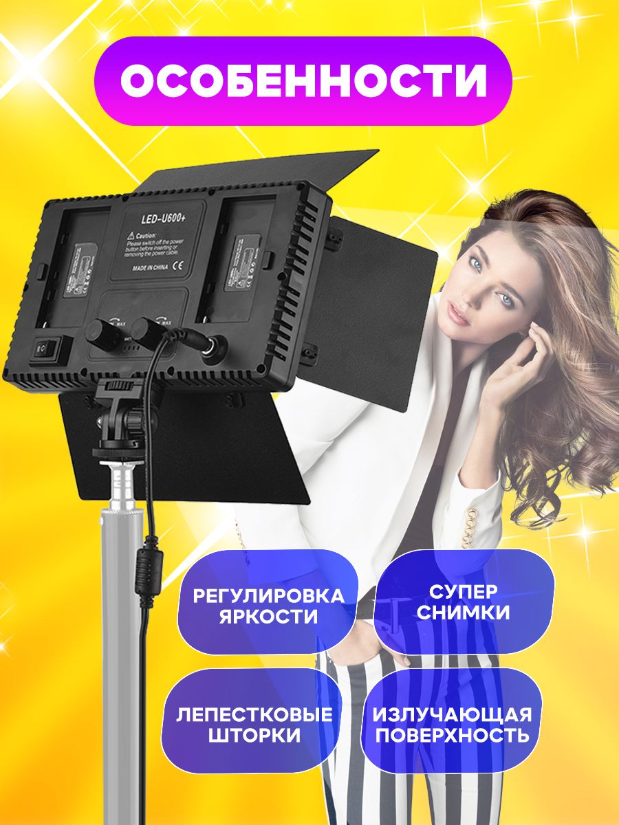 Описание: Видео свет- это идеальный вариант освещения, и с ним все намного проще. Хорошо подходит фотографам и тем, кто снимает блоги в разных локациях и в разное время суток. Так же подходит тату мастерам, визажистам, косметологам и другим бьюти сферам. Видеосвет PRO LED U800 Plus состоит из 1120 шт. высококачественных SMD светодиодов со светоизлучающими кристаллами и повышенной областью свечения, что позволяет получать повышенную яркость при том же расходе энергии. Цветовая температура данной панели регулируется в диапазоне от 3200К до 6500К. В любой момент видеосвет можно взять с собой, так как есть возможность подключить сразу 2-х аккумулятором. На видеосвете присутствует индикатор заряда батареек. Режимы настраиваются плавными диммерами. Один диммер отвечает за теплую температуру и яркость, второй за холодную и яркость. Накамерный светодиодный осветитель подойдет как основной или дополнительный источник света при фото и видеосъемке.