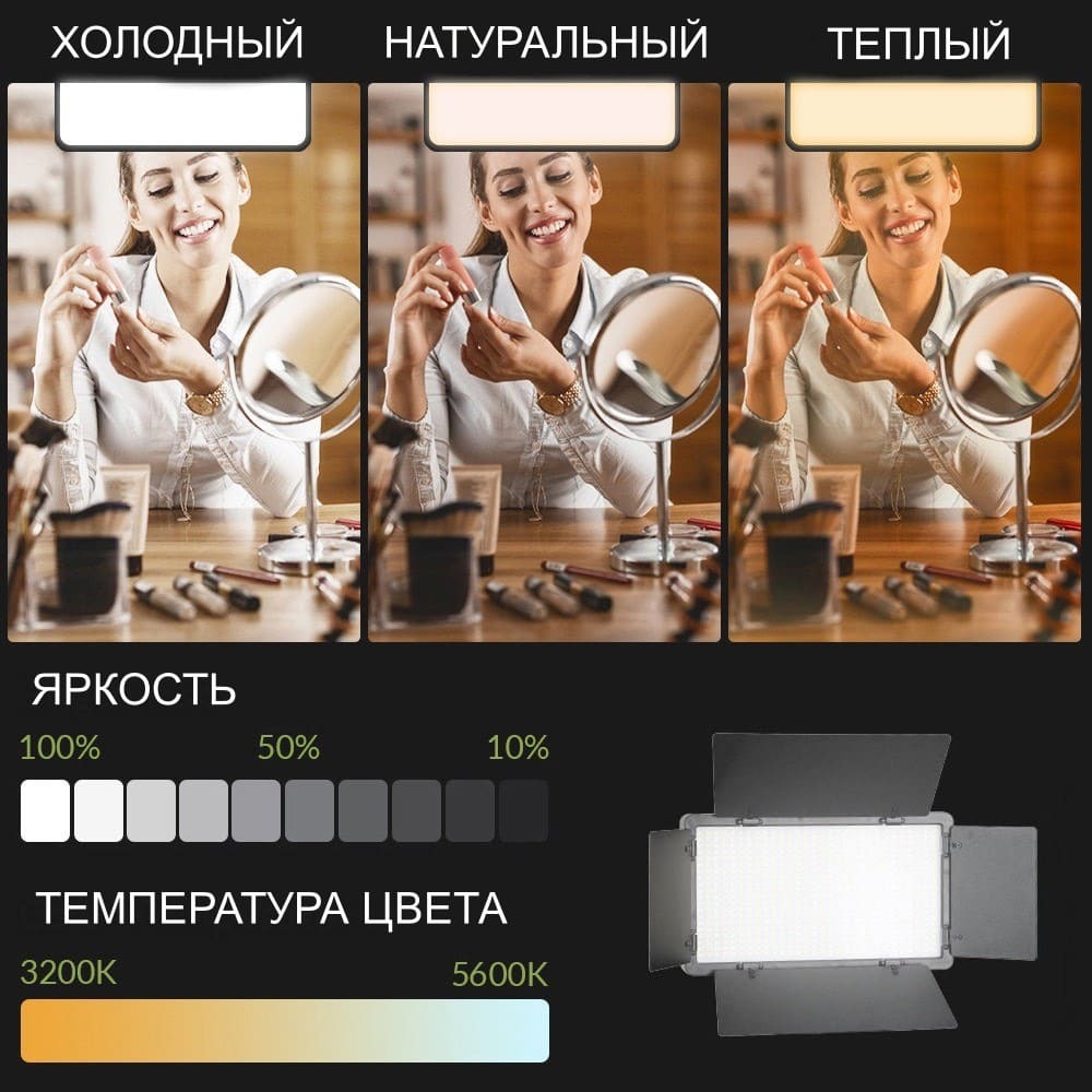 Описание: Видеосвет U800 это профессиональный свет для фотостудии. Хорошее освещение залог успеха не только для фотографов, но и для тех, кто снимает видео. Световая панель подходит тем, кто снимает в разных локациях и в разное время суток, Светодиодный осветитель можно использовать как основной свет, а можно применять для съемки видео на ходу. Также подходит тату мастерам, визажистам, косметологам и другим бьюти сферам. Светодиодная панель является ярким источником света к тому же очень компактным. Из-за компактности видеосвет может быть всегда под рукой. Его легко можно взять с собой положив в сумку. LED-панель обеспечивает постоянное освещение, алюминиевые шторки помогут настроить поток света, а диммеры плавно настроят яркость и цветовую температуру. В благодарность за покупку мы дарим настольный штатив рукоятку.