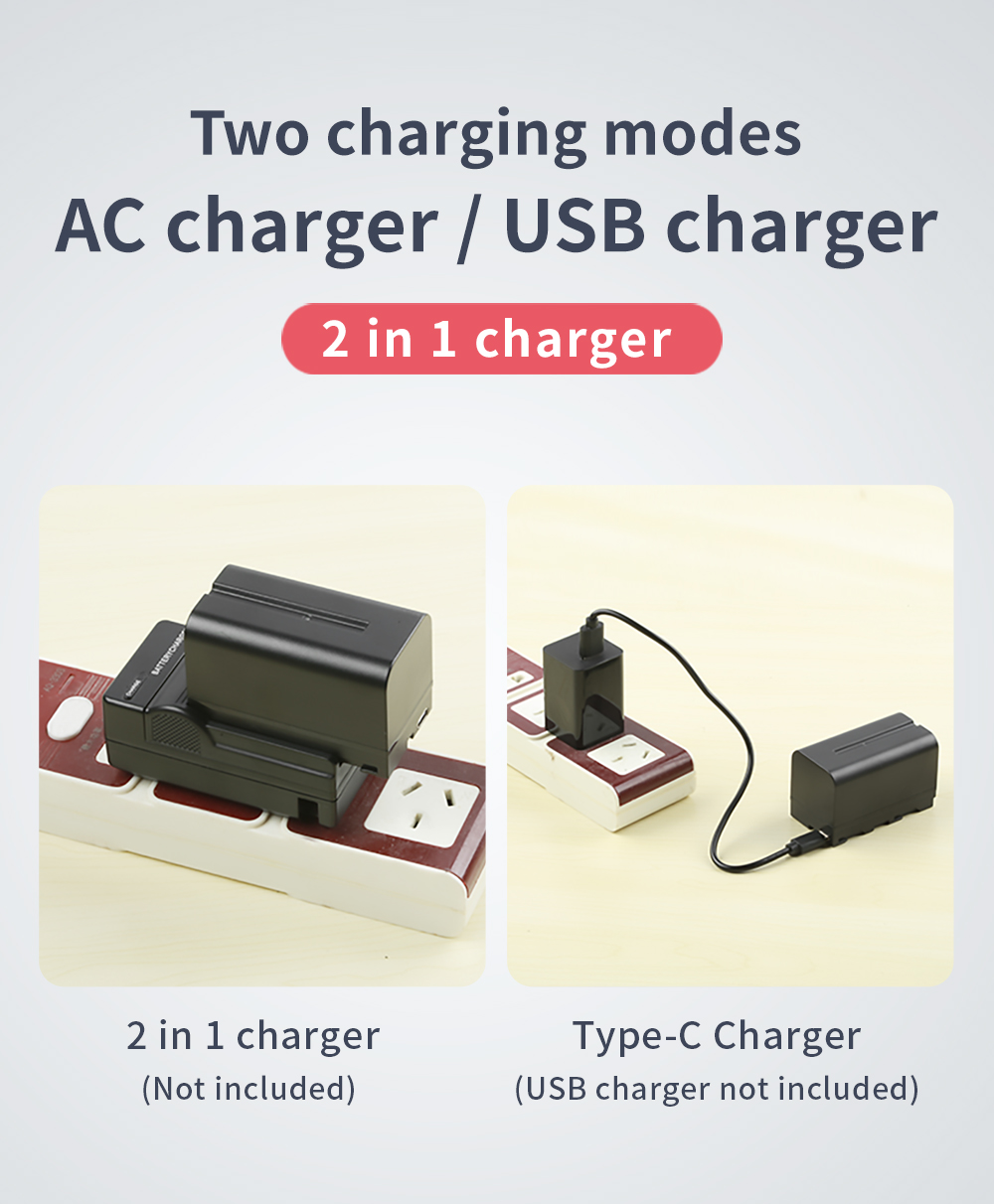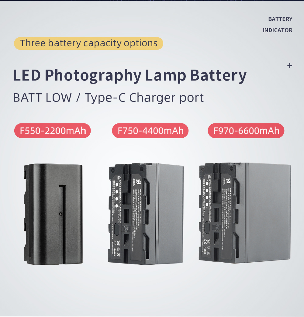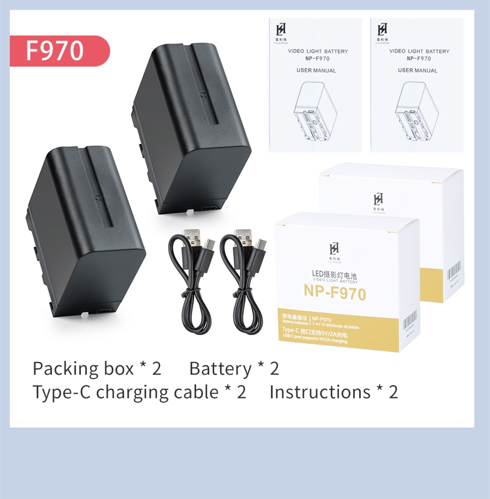 2 упаковки NP-F550,NP-F750,NP-F970 батареи для видео светильник емкостью 2200 мАч/4800 мАч/6600 мАч. Отлично работает для питания выбранного светодиодный видео светильник, светодиодный камеры светильник, кольца светильник или видеомонитора.