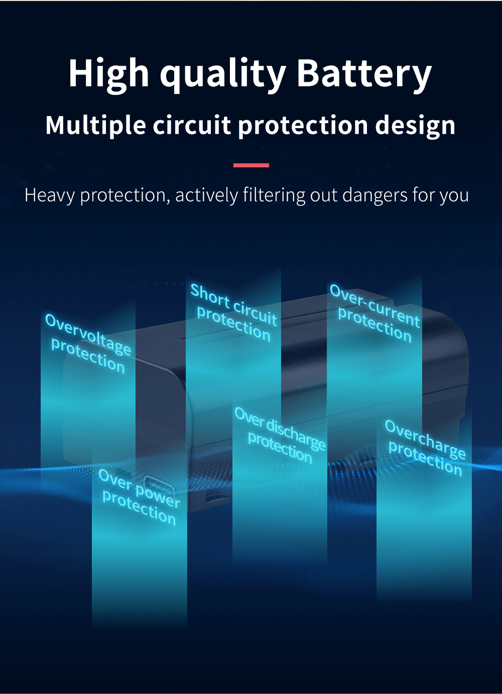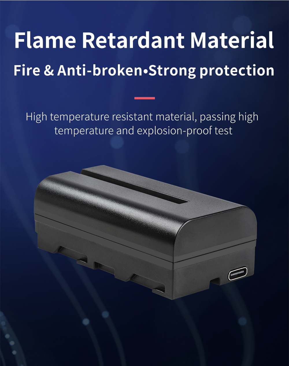 Изготовленные из огнестойкого материала и прочного соединения, батареи этой серии NP-F для видео светильник защищают ваше снаряжение. Обеспечивают защиту от перезарядки, чрезмерной разрядки, перегрузки по току, перегрева, короткого замыкания, перегрузки по мощности для безопасности и стабильности аккумулятора.