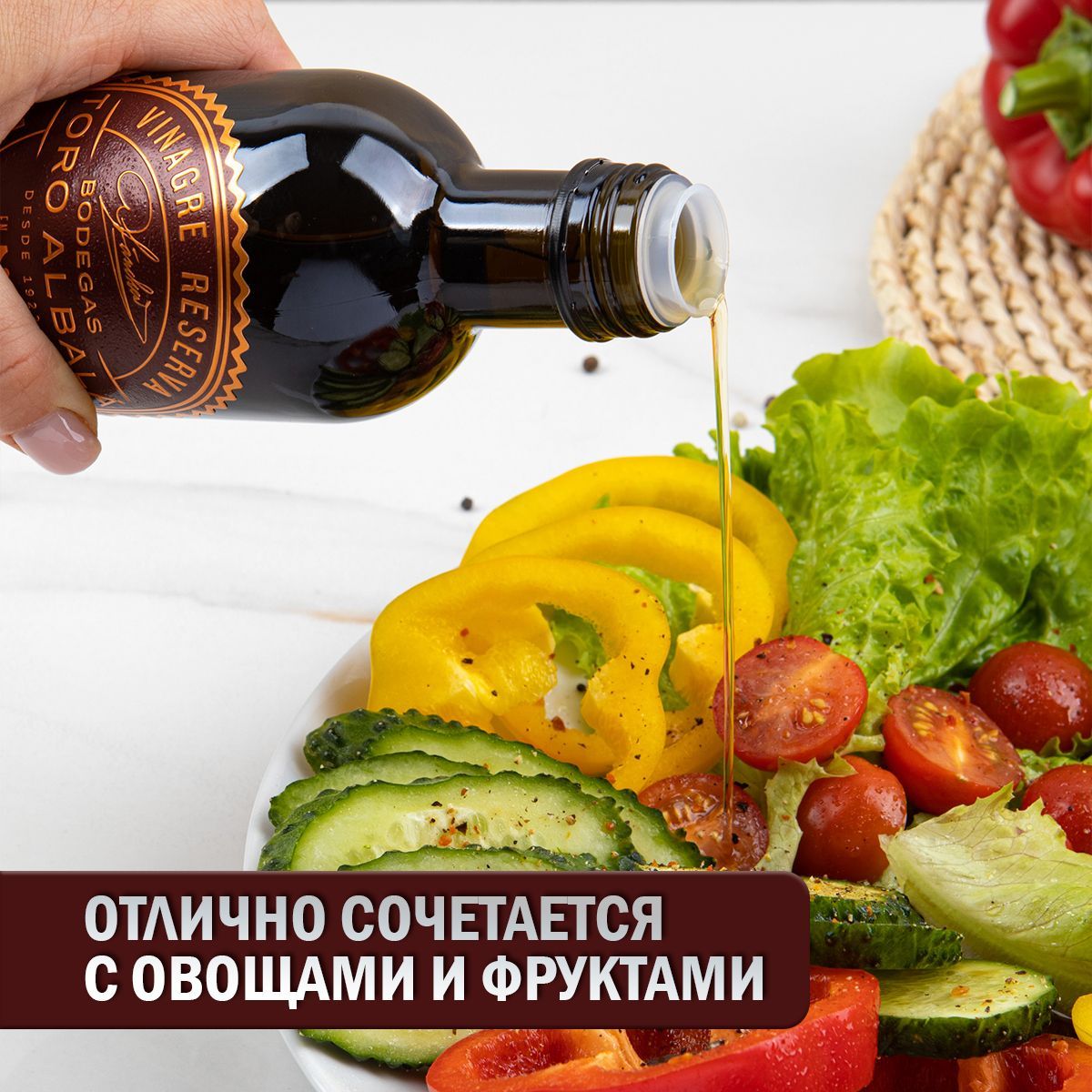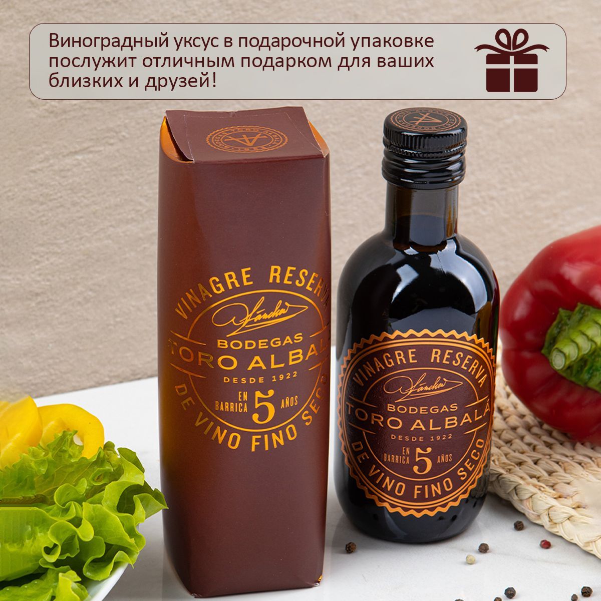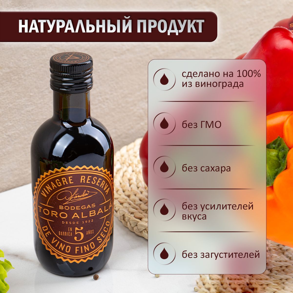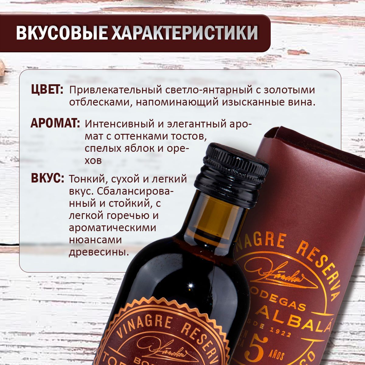 Это виноградный уксус изготовлен из изысканных вин Олоросо и выдерживается не менее пяти лет. Избирательное сочетание, которое придает несравненные ароматы самым изысканным блюдам.