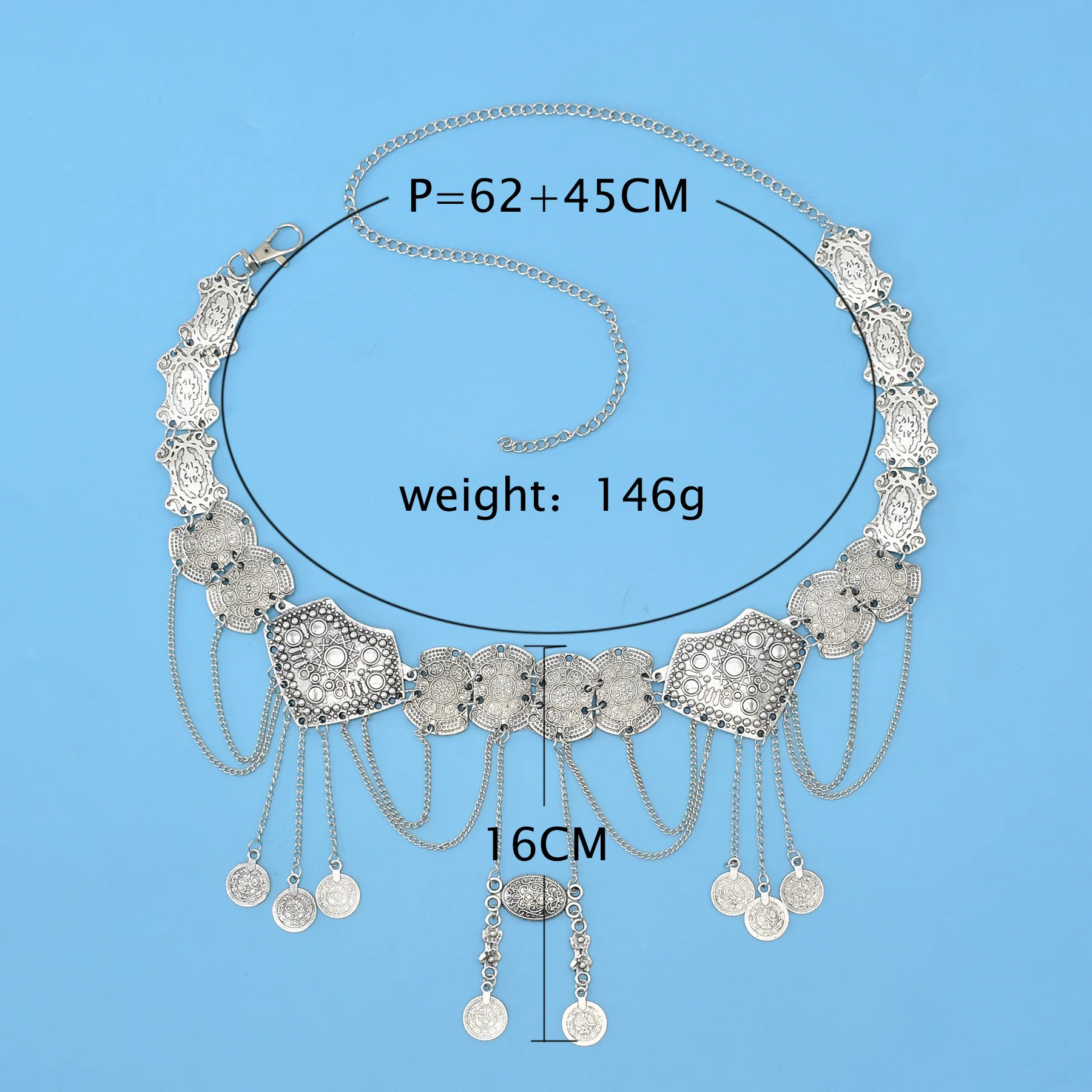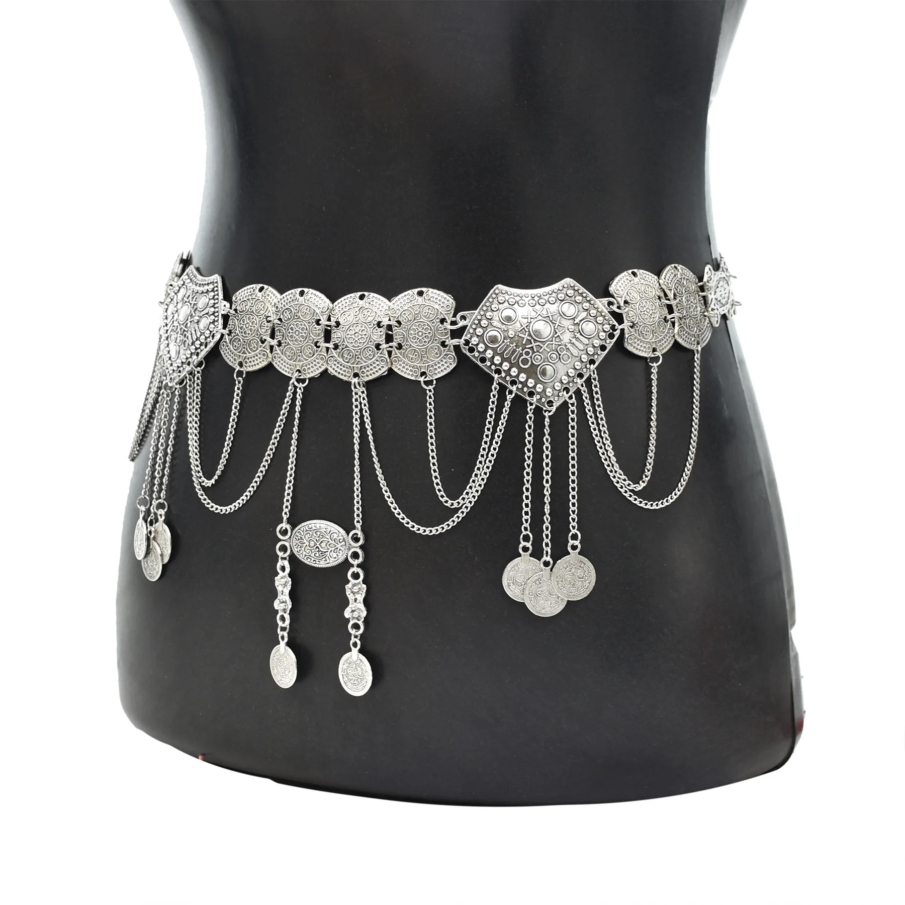 Vintage Silver Metal Carved Waist Chain Gypsy Afghan Coin Tassel Dress Clothing Waist Chain