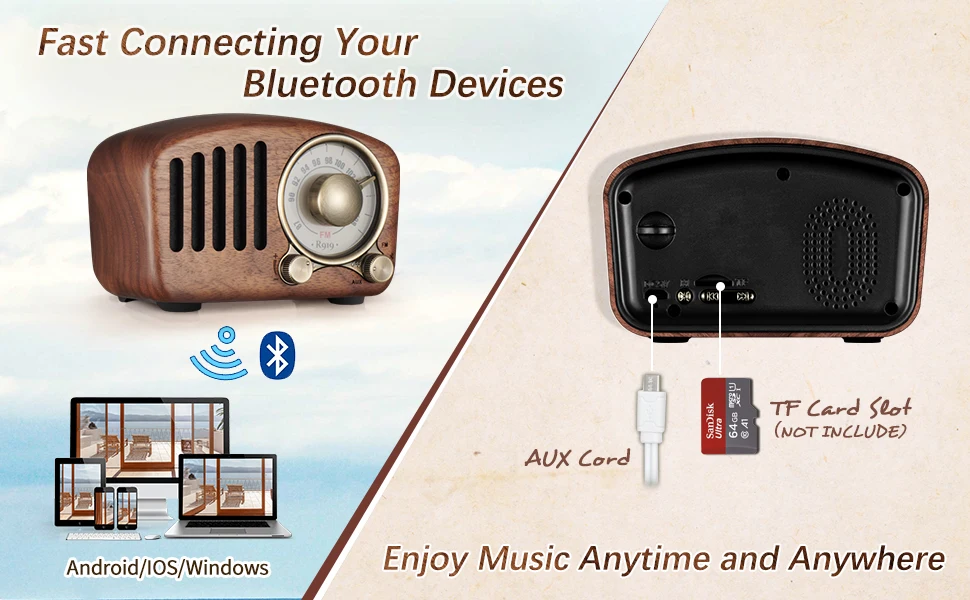 1) Поддерживает TF-карту (0-32 ГБ). Значит, у него есть дополнительная функция MP3. 2) С функциями AUX и Bluetooth (диапазон Bluetooth = 10 м). Вы можете легко использовать радио в качестве динамика телефона или компьютера. 3) Оснащен встроенным магнитным динамиком мощностью 3 Вт, который обеспечивает надежные глубокие басы и плавные высокие частоты.