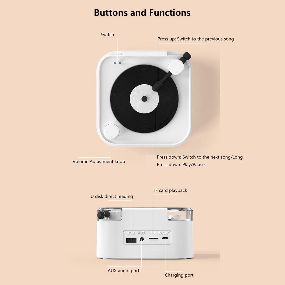 4. Отличительная особенность: Почувствуйте очарование и чувства ретро с этим портативным беспроводным динамиком. Он имеет дизайн поворотного стола, который имитирует классический внешний вид граммофона, но с современными функциями и качеством звука. Вы можете наслаждаться музыкой в любом месте и в любое время, одновременно сочетая классические чувства и современную эстетику.