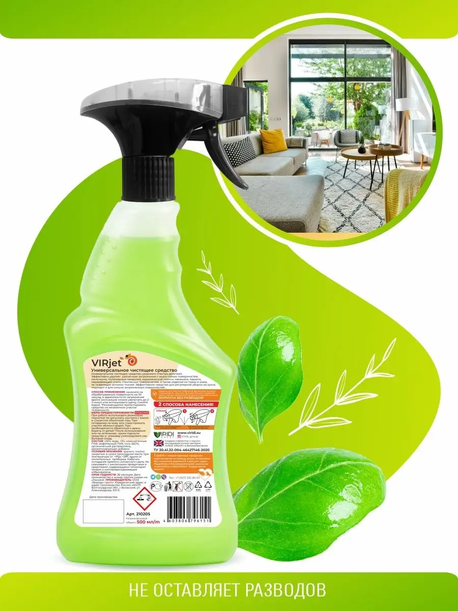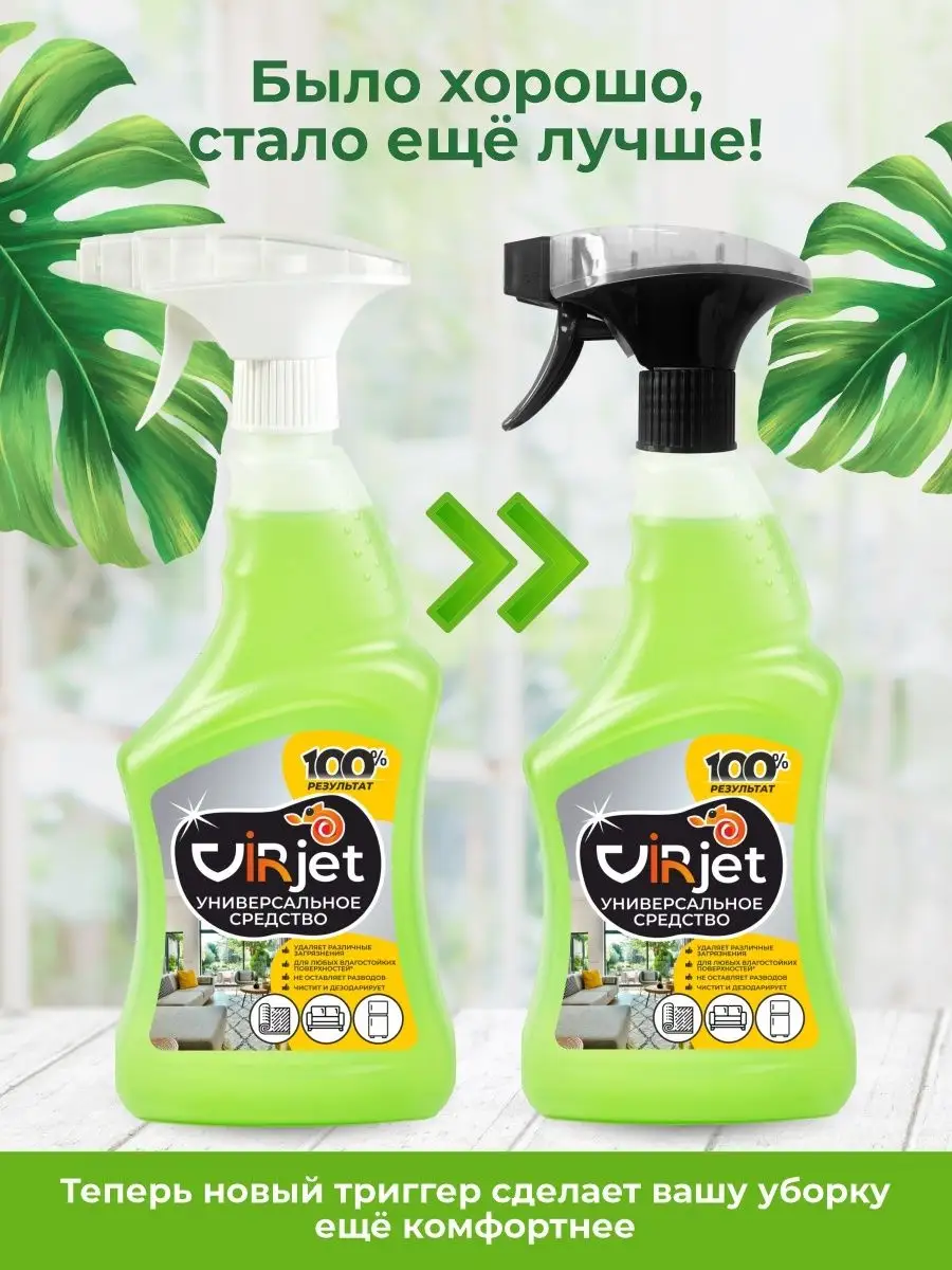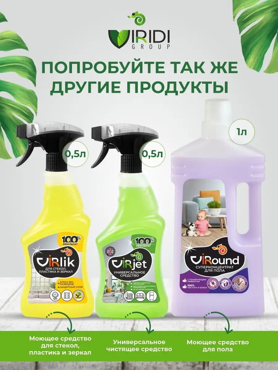 Описание: Собери коллекцию средств для безопасной и эффективной уборки дома от VIRIDI GROUP: Спрей Virsant для туалета и ванной комнаты с антибактериальным эффектом - универсальное кислотное чистящее средство для чистки душевых кабин, сантехники в ванной комнате и туалете. Особенности: очищение удаление пятен антикамень антикальций очиститель налета и ржавчины дезодорирование - устраняет неприятные запахи и возвращает блеск. Высокоэффективное моющее средство для борьбы с загрязнениями на любых поверхностях, требующих деликатного ухода - для чистки раковины из камня пластика ванной а также - душевая кабина унитаз кафельная плитка фаянсовые покрытия бассейн хромированные краны и смесители от въевшихся загрязнений известкового отложения мочевого и водного камня остатков мыльных моющих средств. Удаляет патогенные бактерии и микроорганизмы - борется с плесенью на стенах и в труднодоступных местах - затирочных швах. Обладает водоотталкивающим действием, образуя пленку надолго защищает поверхность и замедляет последующее загрязнение. Безопасен для акрила и хрома. Естественный и свежий аромат великолепного микса из полевых растений, произрастающих на степных и горных просторах. Virjet антижир - чистящее средство для мгновенного удаления самых стойких застарелых и подгоревших масложировых загрязнений. Избавит от нагара копоти ржавчины с поверхностей кухонных и стеклокерамических плит мультиварок духовых шкафов микроволновых СВЧ печей грилей фритюрниц кастрюль сковородок пароуловителей вытяжек кафельной плитки и других влагостойких поверхностей. Отлично справляется на даче с копотью на камине печи подходит для шампуров грилей. Эффективно очищает благодаря активным компонентам, имеет пульверизатор с пенным точечным распылением. Не содержит токсичных и едких веществ. Отсутствует аэрозольное облако и едкий запах, что снижает раздражение слизистой глаз и носоглотки при применении - безопасен для человека, природы и септиков, 100% смывается водой. Эко моющее средство мягко воздействует, не оставляя царапин и разводов. Супермощный концентрат действует за 30 секунд. Virlik для стекол, пластика и зеркал без разводов, 500 мл с удобным пенным триггером. Моющие средство не требует смывания и идеально подходит для пластика мебели и бытовой техники - для очистки оконных витринных автомобильных стекол хромированных и пластиковых поверхностей поверхностей из нержавеющей стали акрила зеркал кафеля внешних панелей электробытовых приборов мебели хрусталя керамики фарфора экрана монитора телевизора. Превосходно очищает, придает блеск и антистатический эффект оставляя защитный слой, препятствующий налипанию пыли и последующим загрязнениям. Освежающая смесь ароматов листьев бергамота, мускатного шалфея и перечной мяты с легкой цитрусовой ноткой, свежих весенних цветов и мягкого успокаивающего мускуса. В составе только экологичные и гипоаллергенные компоненты. Virjet универсальное чистящее средство для уборки во всем доме широкого спектра действия: очищение поглощение запахов удаление пятен. Эффективно удаляет различные загрязнения с водостойких поверхностей в ванной комнате кухне мебели салоне автомобиля и даже коврах линолеума полимерных покрытий плитки ламината паркета нержавеющей стали стеклянных поверхностей, а также издели