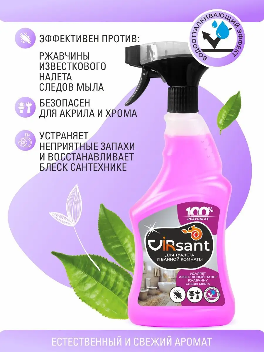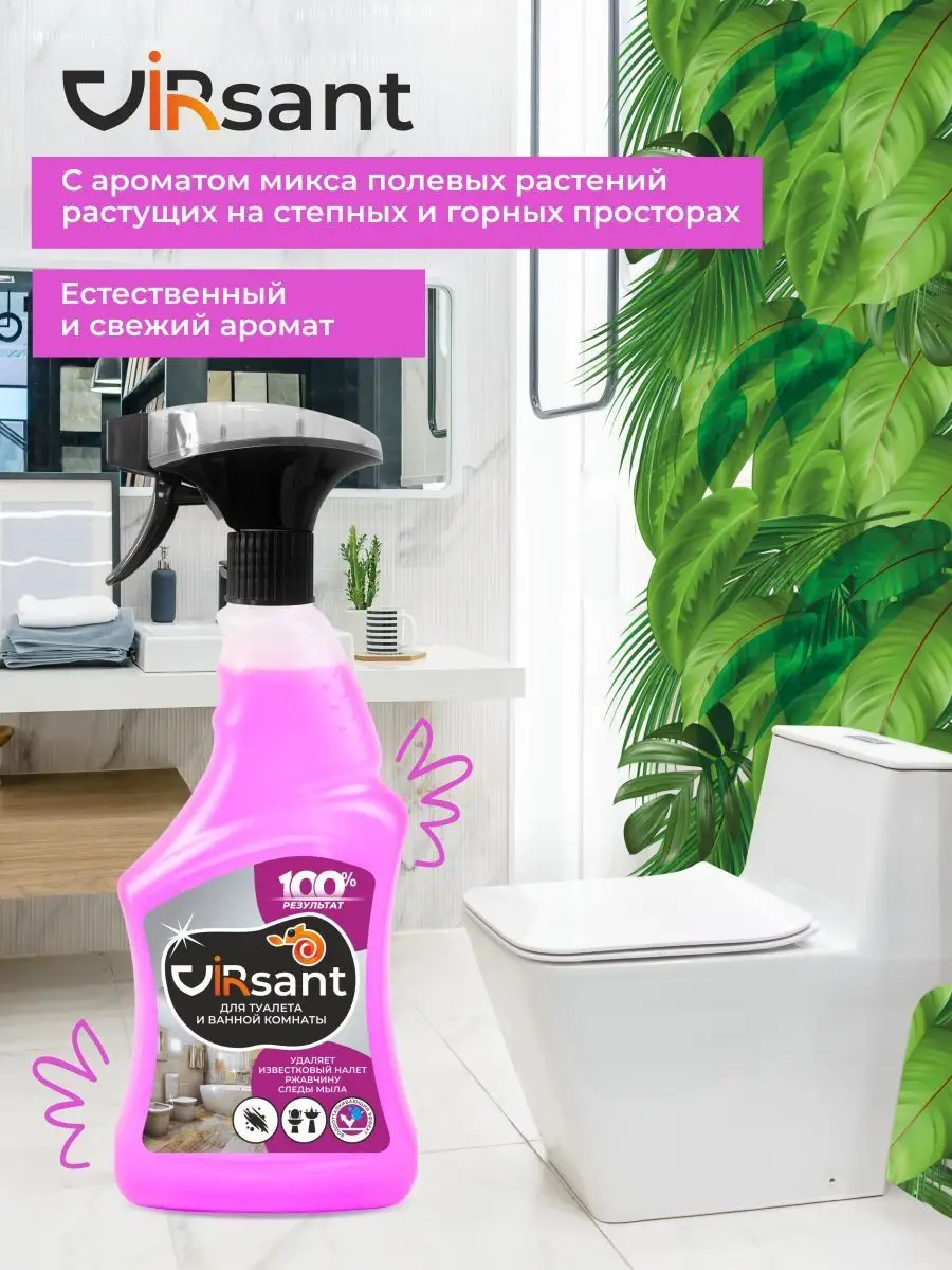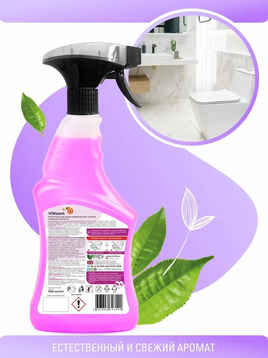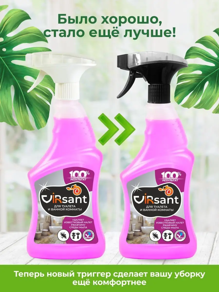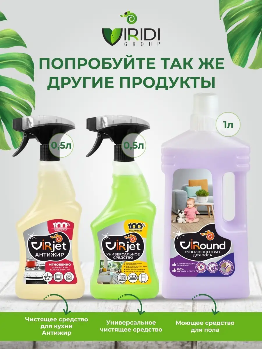 Описание: Собери коллекцию средств для безопасной и эффективной уборки дома от VIRIDI GROUP: Спрей Virsant для туалета и ванной комнаты с антибактериальным эффектом - универсальное кислотное чистящее средство для чистки душевых кабин, сантехники в ванной комнате и туалете. Особенности: очищение удаление пятен антикамень антикальций очиститель налета и ржавчины дезодорирование - устраняет неприятные запахи и возвращает блеск. Высокоэффективное моющее средство для борьбы с загрязнениями на любых поверхностях, требующих деликатного ухода - для чистки раковины из камня пластика ванной а также - душевая кабина унитаз кафельная плитка фаянсовые покрытия бассейн хромированные краны и смесители от въевшихся загрязнений известкового отложения мочевого и водного камня остатков мыльных моющих средств. Удаляет патогенные бактерии и микроорганизмы - борется с плесенью на стенах и в труднодоступных местах - затирочных швах. Обладает водоотталкивающим действием, образуя пленку надолго защищает поверхность и замедляет последующее загрязнение. Безопасен для акрила и хрома. Естественный и свежий аромат великолепного микса из полевых растений, произрастающих на степных и горных просторах. Virjet антижир - чистящее средство для мгновенного удаления самых стойких застарелых и подгоревших масложировых загрязнений. Избавит от нагара копоти ржавчины с поверхностей кухонных и стеклокерамических плит мультиварок духовых шкафов микроволновых СВЧ печей грилей фритюрниц кастрюль сковородок пароуловителей вытяжек кафельной плитки и других влагостойких поверхностей. Отлично справляется на даче с копотью на камине печи подходит для шампуров грилей. Эффективно очищает благодаря активным компонентам, имеет пульверизатор с пенным точечным распылением. Не содержит токсичных и едких веществ. Отсутствует аэрозольное облако и едкий запах, что снижает раздражение слизистой глаз и носоглотки при применении - безопасен для человека, природы и септиков, 100% смывается водой. Эко моющее средство мягко воздействует, не оставляя царапин и разводов. Супермощный концентрат действует за 30 секунд. Virlik для стекол, пластика и зеркал без разводов, 500 мл с удобным пенным триггером. Моющие средство не требует смывания и идеально подходит для пластика мебели и бытовой техники - для очистки оконных витринных автомобильных стекол хромированных и пластиковых поверхностей поверхностей из нержавеющей стали акрила зеркал кафеля внешних панелей электробытовых приборов мебели хрусталя керамики фарфора экрана монитора телевизора. Превосходно очищает, придает блеск и антистатический эффект оставляя защитный слой, препятствующий налипанию пыли и последующим загрязнениям. Освежающая смесь ароматов листьев бергамота, мускатного шалфея и перечной мяты с легкой цитрусовой ноткой, свежих весенних цветов и мягкого успокаивающего мускуса. В составе только экологичные и гипоаллергенные компоненты. Virjet универсальное чистящее средство для уборки во всем доме широкого спектра действия: очищение поглощение запахов удаление пятен. Эффективно удаляет различные загрязнения с водостойких поверхностей в ванной комнате кухне мебели салоне автомобиля и даже коврах линолеума полимерных покрытий плитки ламината паркета нержавеющей стали стеклянных поверхностей, а также издели