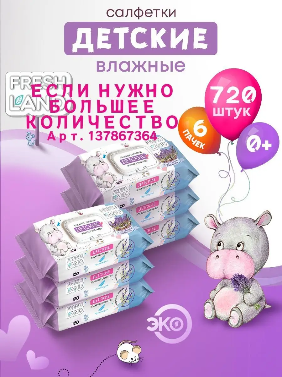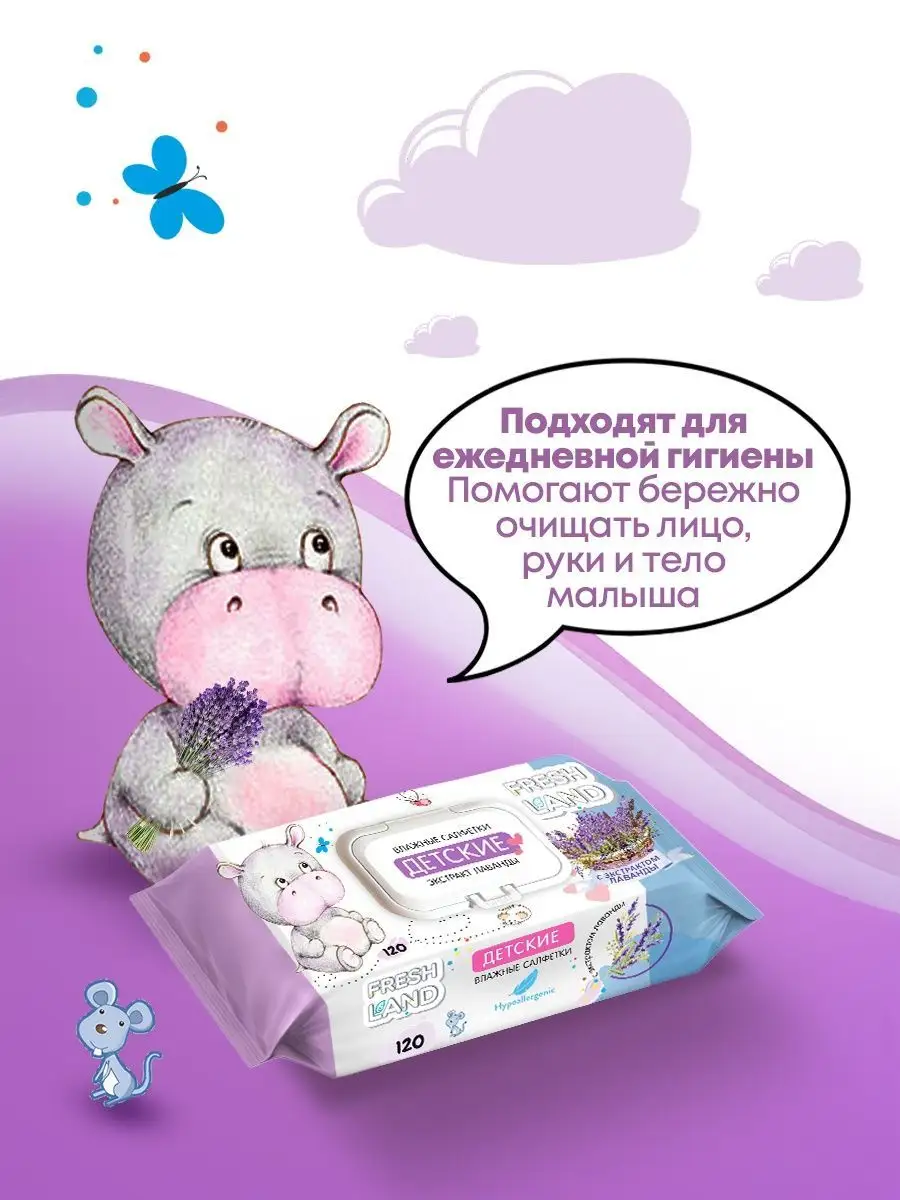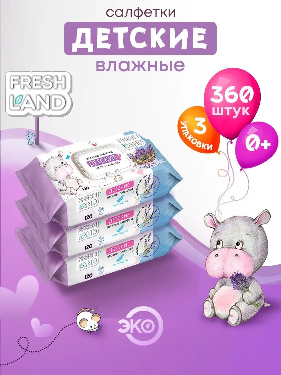 Описание: Набор влажных салфеток бренда FRESHLAND - три упаковки по 120 штук. Мягкие, плотные гипоаллергенные влажные салфетки бережно очищают нежную детскую кожу, увлажняют и питают, предотвращая раздражения и воспаления. В составе средства личной гигиены экологически чистые, безопасные материалы, которые заботятся о коже малыша, сохраняя её здоровой и поддерживают естественный уровень pH кожи ребенка. Влажные салфетки для детей не содержат спирта, с легким ароматом лаванды. Качественный материал не пропускает никаких загрязнений. Салфетки не мылятся, не прилипают, обеспечивая комфортное использование. Влажные салфетки для новорожденных незаменимы при смене подгузника в условии отсутствия воды и мыла. Косметика для малыша разработана для удобного использования мамой и комфорта ребенка со второго месяца жизни. Одноразовые влажные салфетки универсальные: подходят для ухода за лицом, руками, для снятия косметики/для снятия макияжа. Каждая упаковка салфеток с экстрактом лаванды для детей надёжно защищена от высыхания пластиковым клапаном. Состав: Нетканое полотно, пропитанное лосьоном: Вода деминерализированная, Полигексаметиленбигуанидина гидрохлорид и Феноксиэтанол (консерванты, необходимые для обеспечения сроков годности салфеток), Глицерин, Кокамидопропилбетаин (мягкое Поверхностно-Активное Вещество), Экстракт лаванды, Гель алоэ, Д-пантенол, Витамин Е, Бисаболол