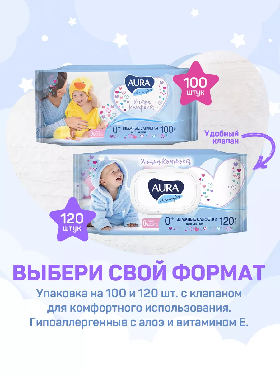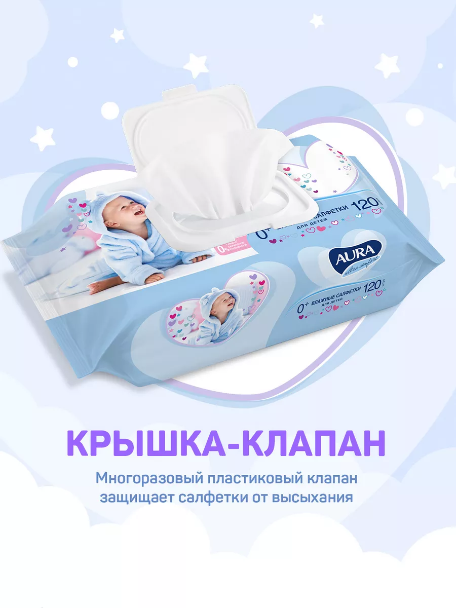 Количество предметов в упаковке 720 влажных салфеток; 6 упаковок по 120 салфеток; влажные салфетки для детей AURA 720 шт
