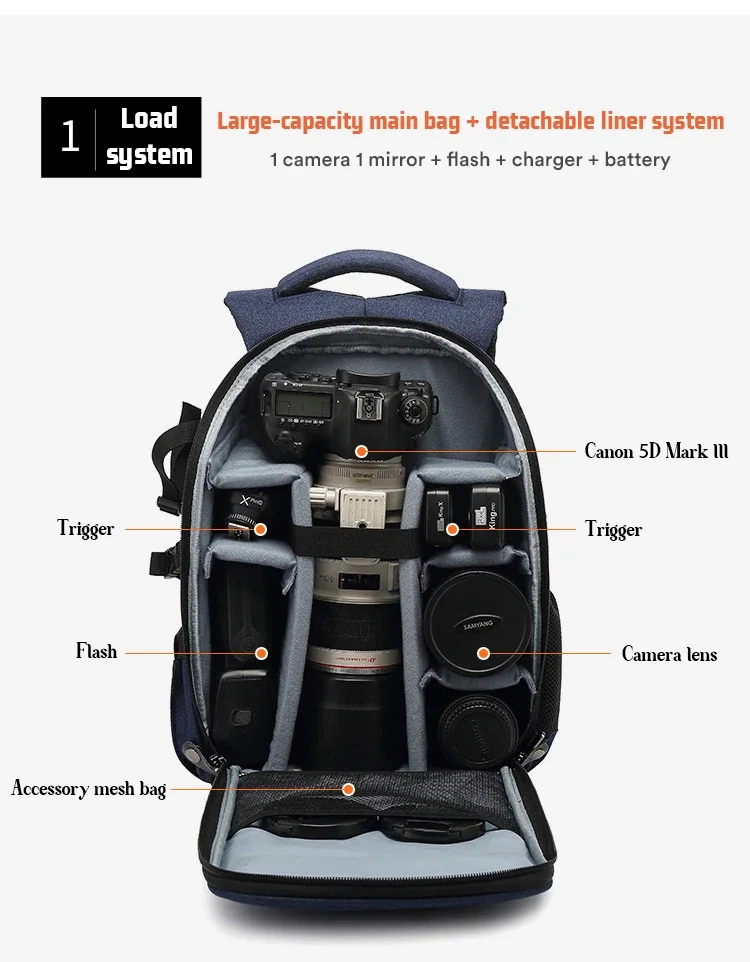 3. Может загружать корпус цифровой зеркальной камеры, а также объектив и 1-2 дополнительных объектива и аксессуары.