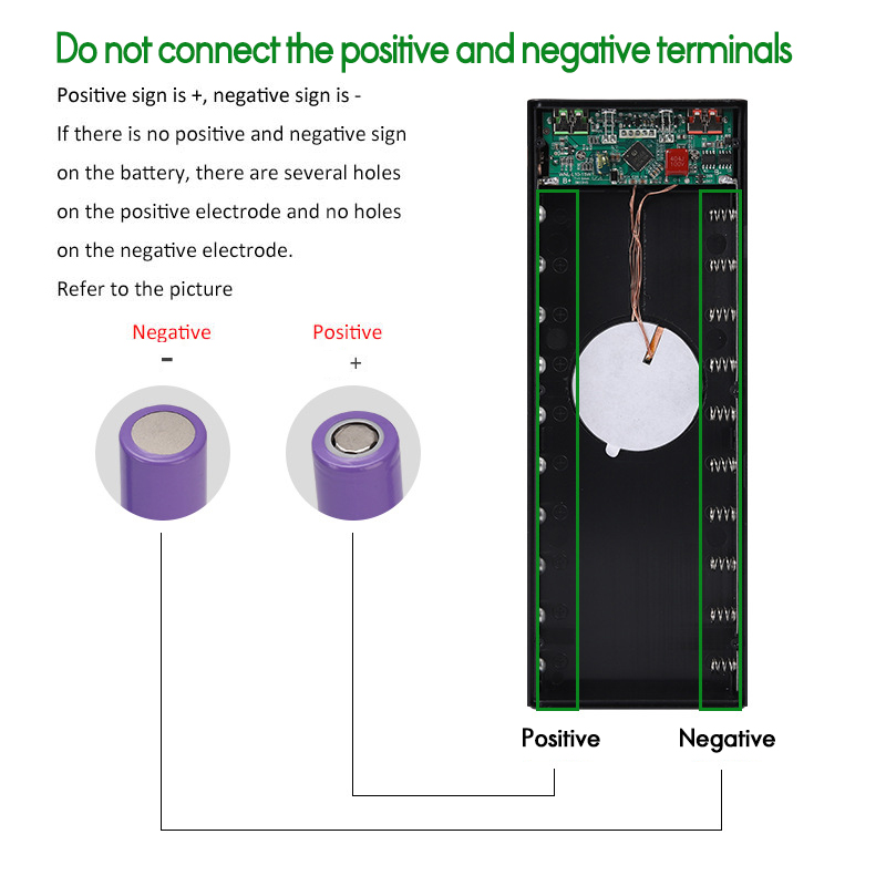 1. Установите аккумулятор правильно в соответствии с положительным и отрицательным полюсами аккумулятора.