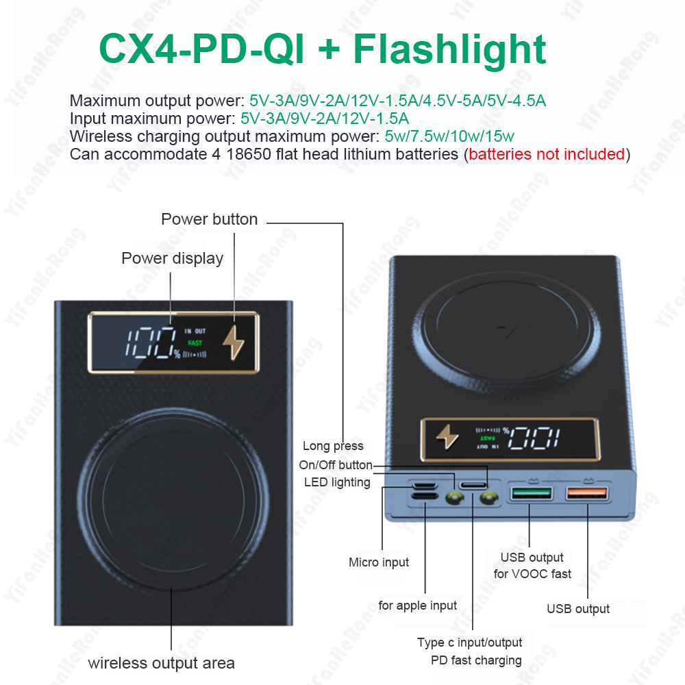 Выход беспроводной зарядки 10 Вт, можно установить литиевую батарею 4x1865 0.
