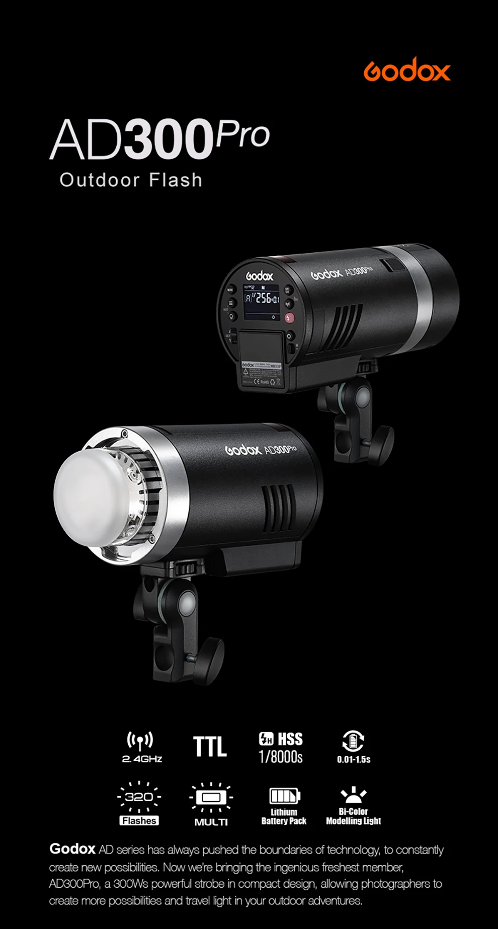 Наружная вспышка GODOX AD300ProОбладает высокой мощностью, легким весом, компактными размерами и отличной портативностью. AD300Pro поддерживает различные аксессуары, заменяя разные переходные кольца. Ваш процесс съемки станет более плавным при использовании AD300Pro. Легко добиться правильной экспозиции вспышки даже в сложных условиях изменения света